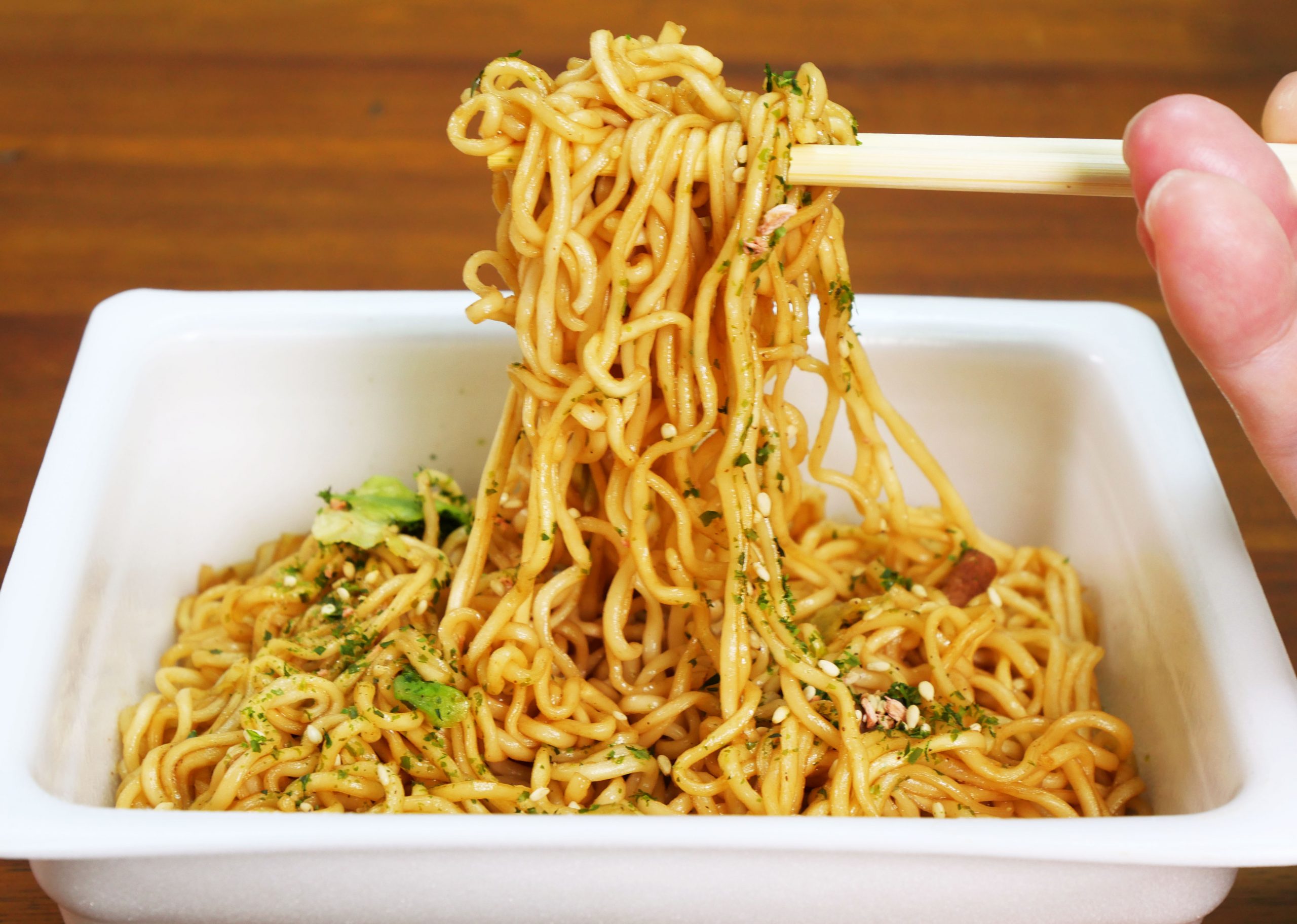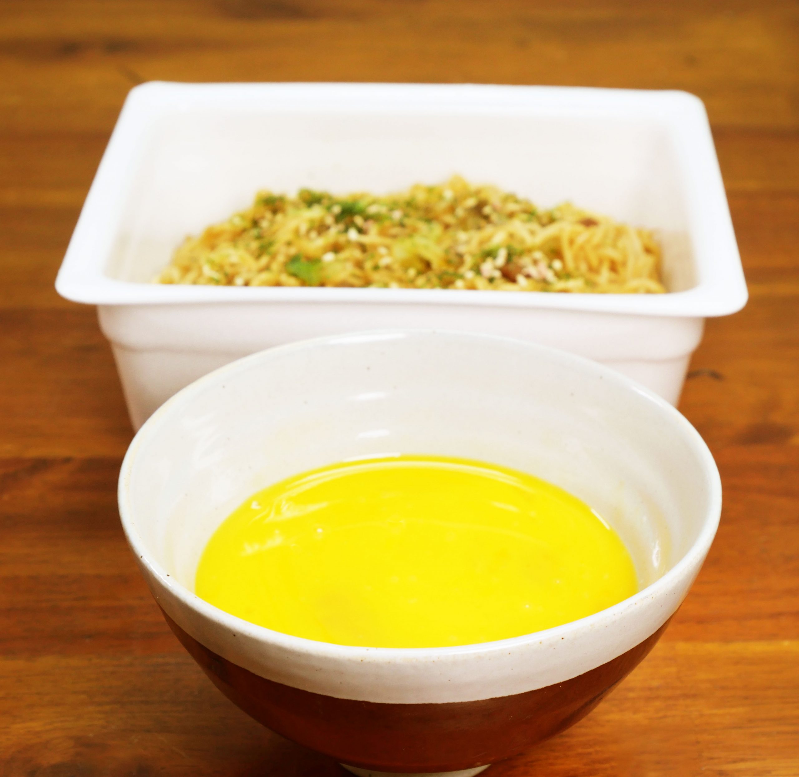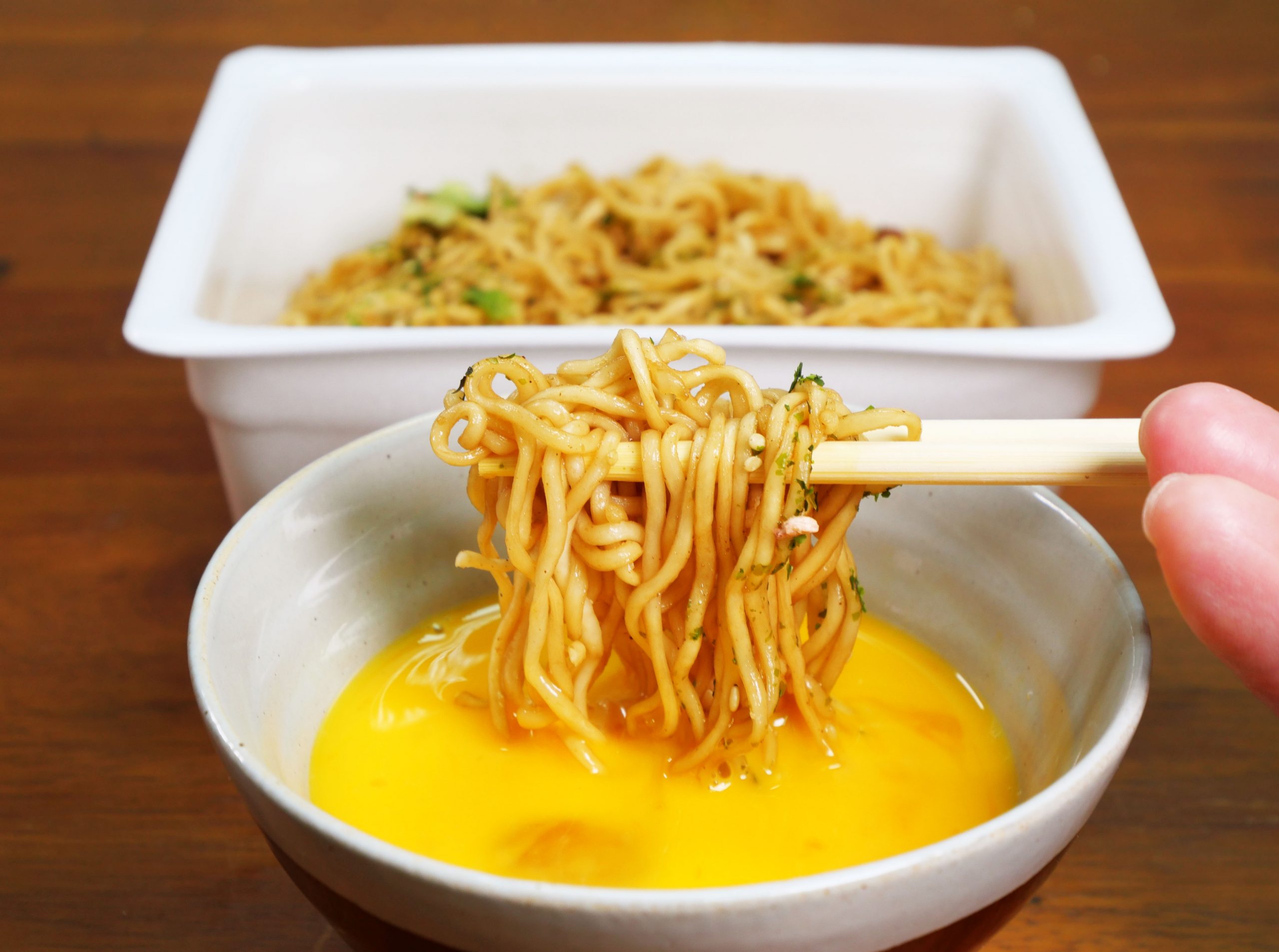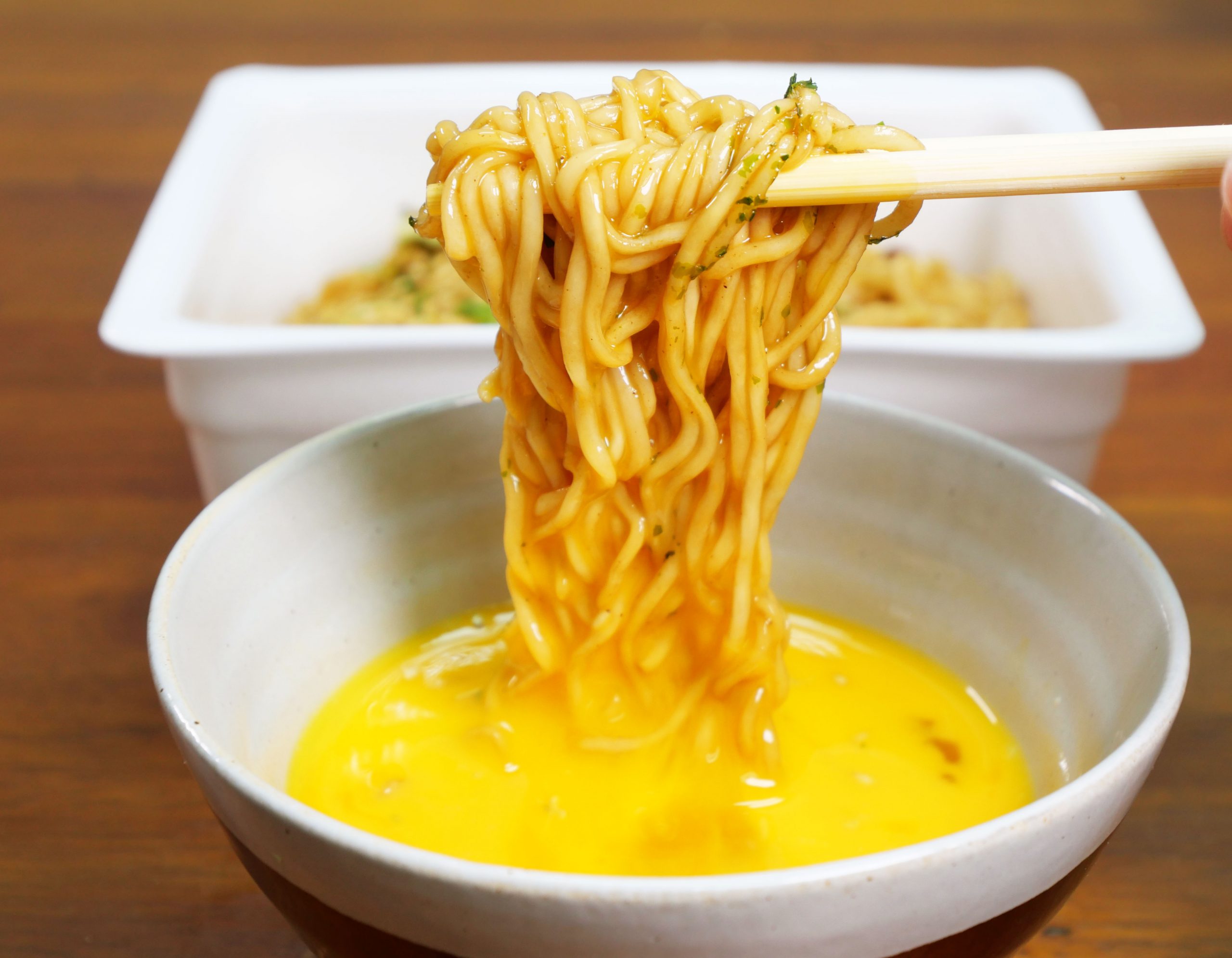 生卵に包まれたペヤングが、生卵のヴェールを解き放って、