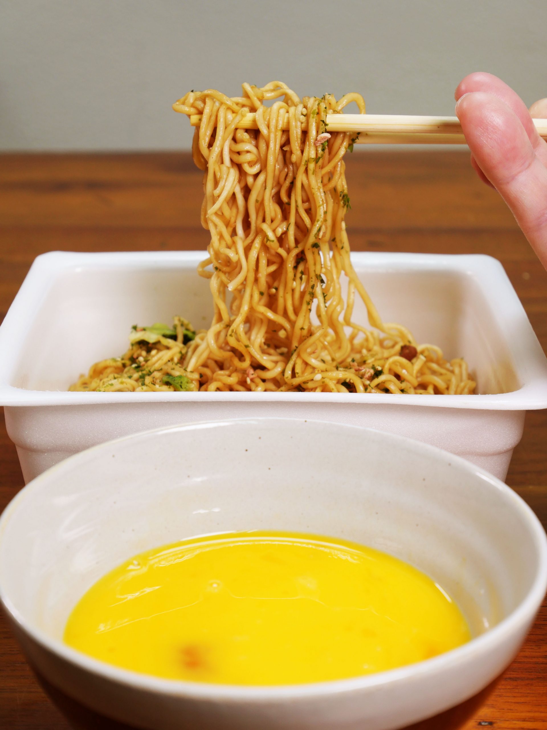 あとはペヤングの麺を生卵に浸して食べるだけ。