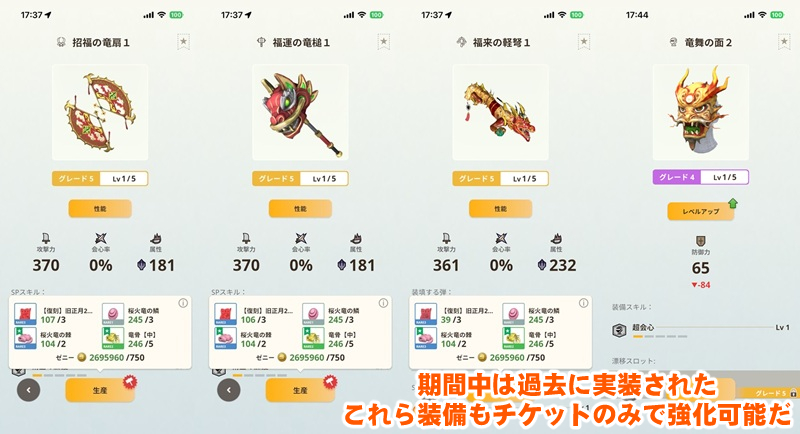 以下の期間中は強化に必要な素材が大幅に削減され、ゼニーや採集素材などを使わずに一定のグレードまで“旧正月装備強化チケット”だけで強化できるので覚えておこう。
