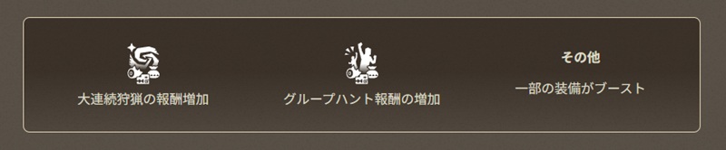 例えば、大連続狩猟では基本報酬の1枠目並びに2枠目の素材数が2個に増加。