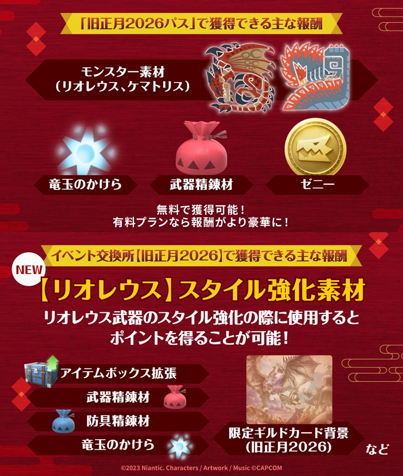 次元変異リオレウスやイベント限定パス、旧正月にちなんだ限定防具やスタンプなど4つのポイント順に解説していくぞ。