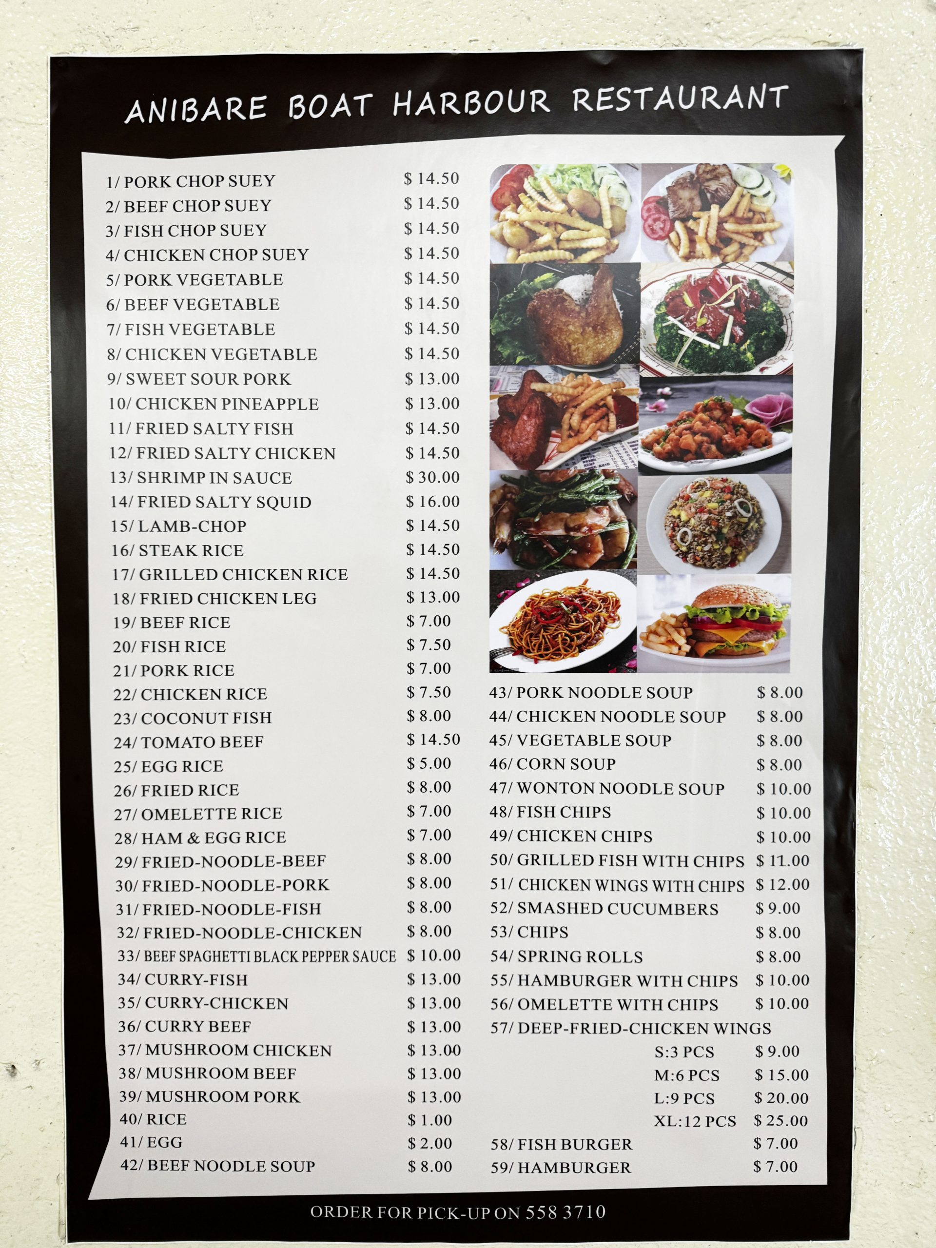 アニバレボートハーバーレストランの魅力は、なんといってもメニューの豊富さと、料理に対する本気度、そして接客の良さ。ハンバーガーやフライドポテトなどの洋食からチャーハン、そしてナウル料理まで、さまざまな料理を堪能できる名店です。