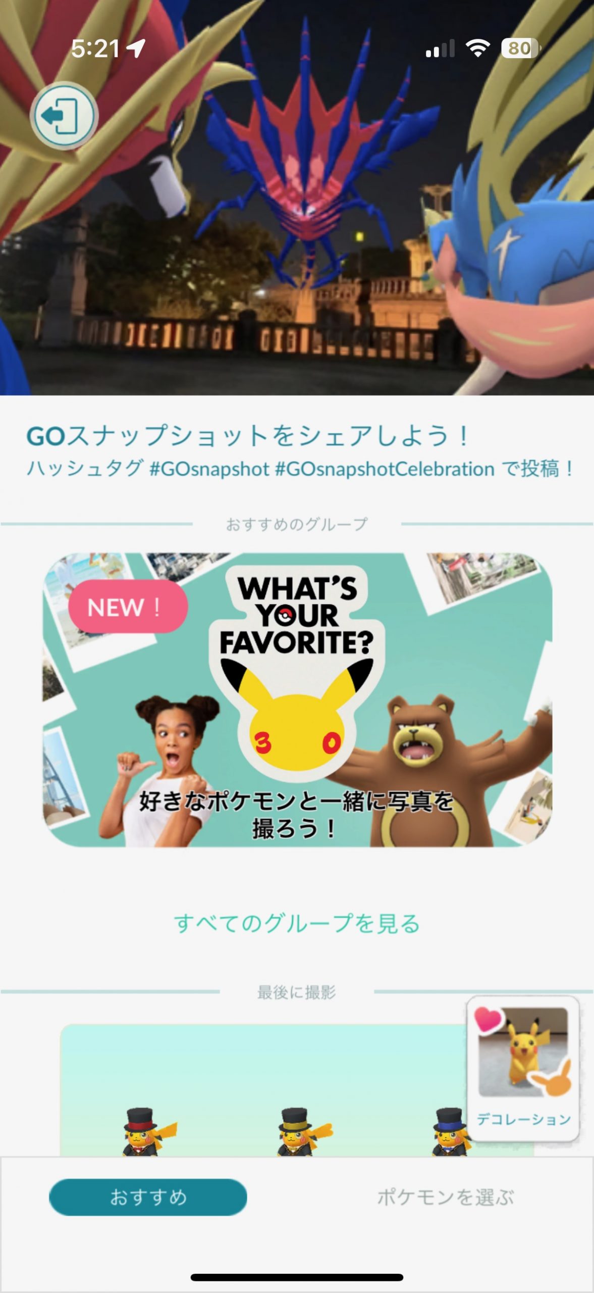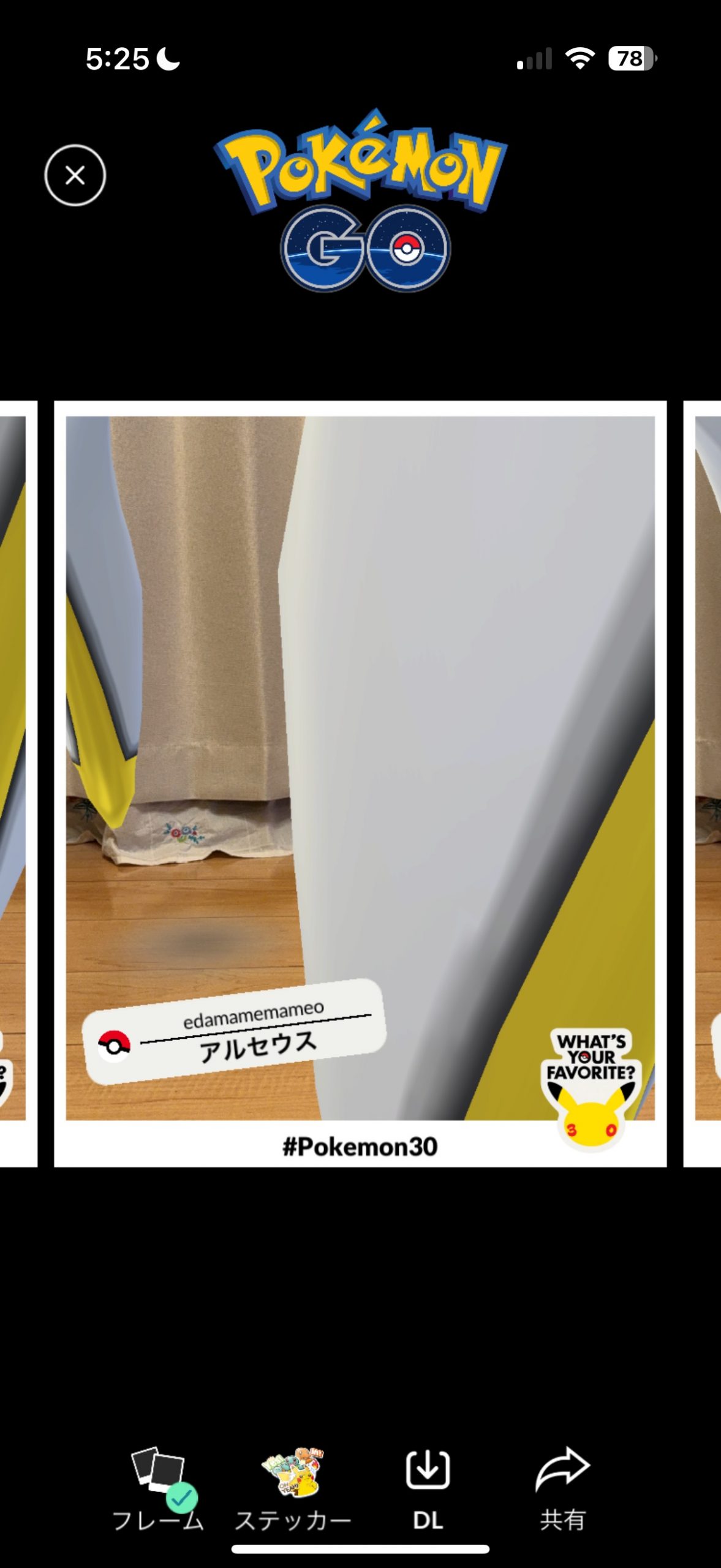 ▲ちなみに「What’s Your Favorite?」 は、GOスナップショットとは違い、人間や景色とポケモンを一緒にすることに特化した機能の模様。1ショットで様々なパターンの表情やアングルを撮影してくれるので便利。