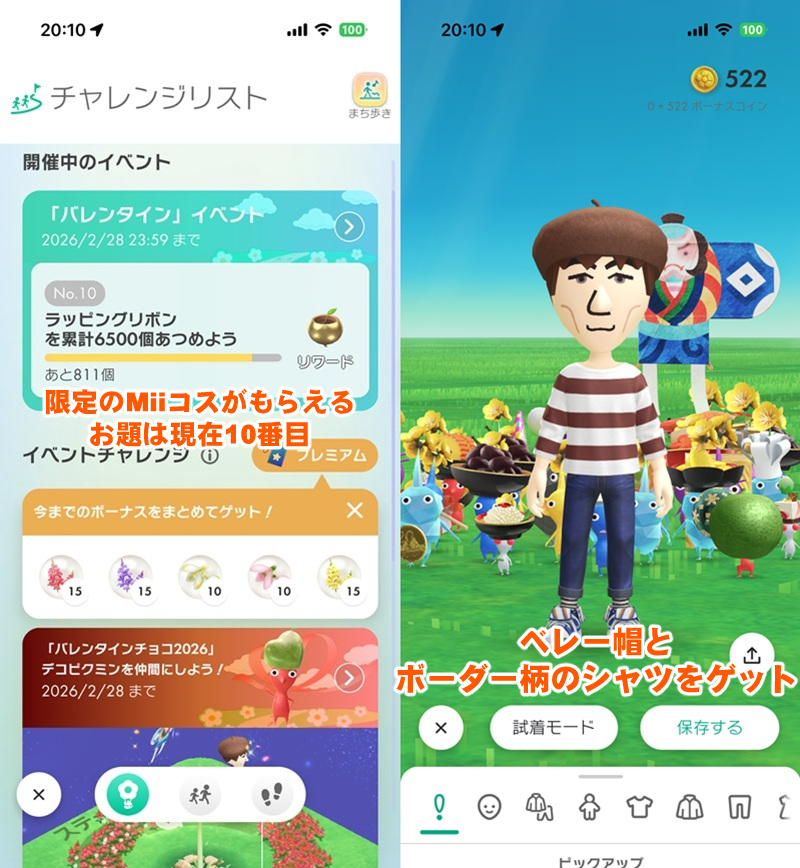 今年度版のチョコレートを身に付けた全8種類のデコピクミンはもちろん、限定Miiコスチュームをもとめて対象のお題をコツコツを進めてきた。
