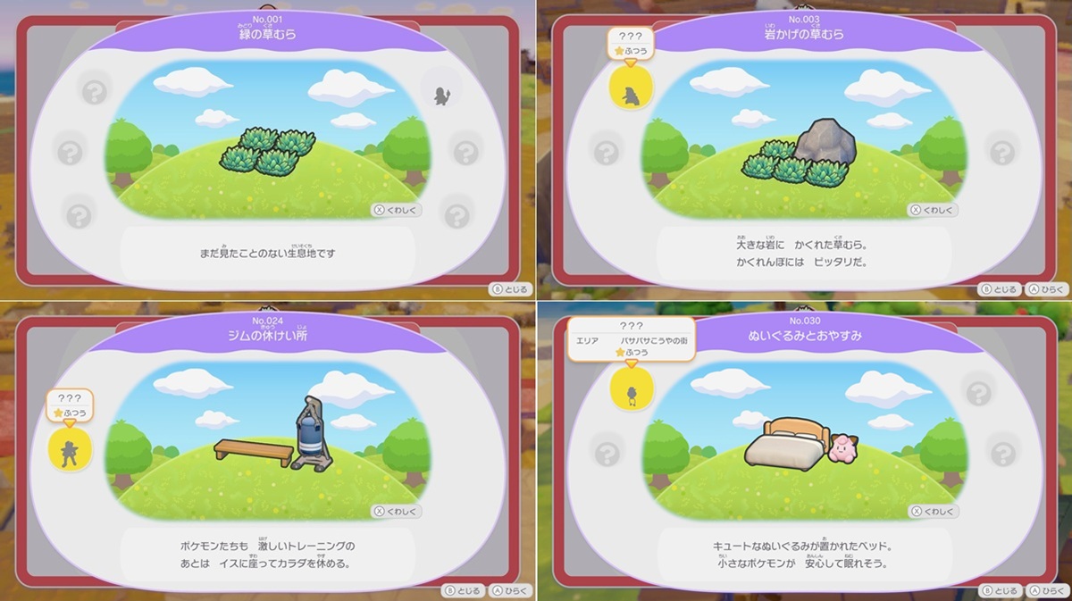 ▲生息地が完成するとポケモンたちがやってくる。モジャンボ(はかせ)のナビゲートと生息地ずかんがあれば、ふだん街づくり系のゲームをしない人でも安心だ。