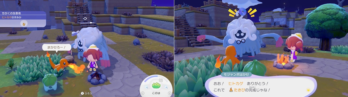 ▲焚き火に火を、街頭に灯りを灯すなどポケモンたちと力を合わせて街をつくる。得意なわざを教わるのはもちろん、こうして助け合う光景はみていて心が安らぐ瞬間だ。