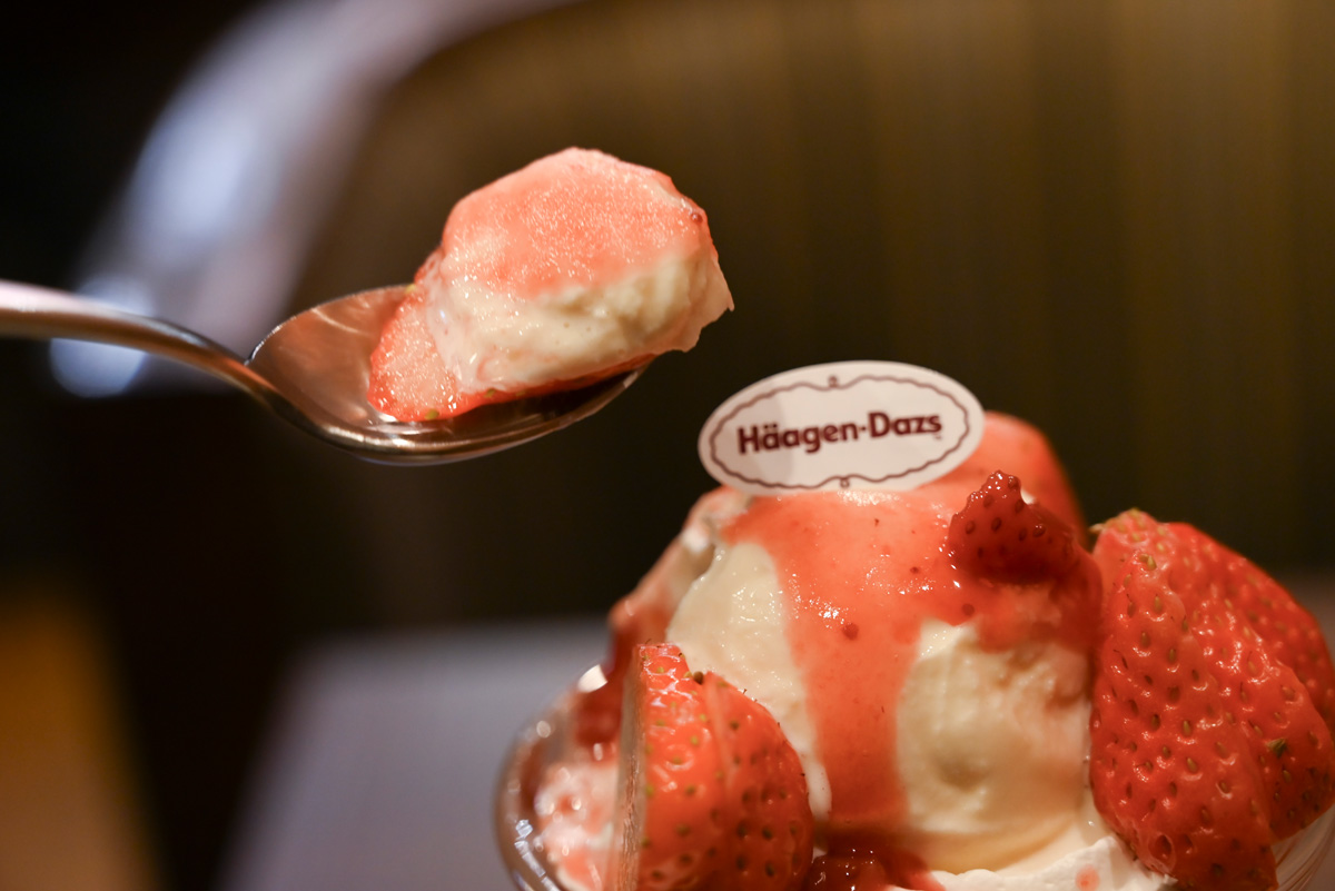 まず実食したのは「苺パフェ with ハーゲンダッツ」。グラスの上にはみずみずしい国産いちごがたっぷりとトッピングされ、その中央にハーゲンダッツ バニラアイスクリームが鎮座する、見た目にも華やかな一品だ。