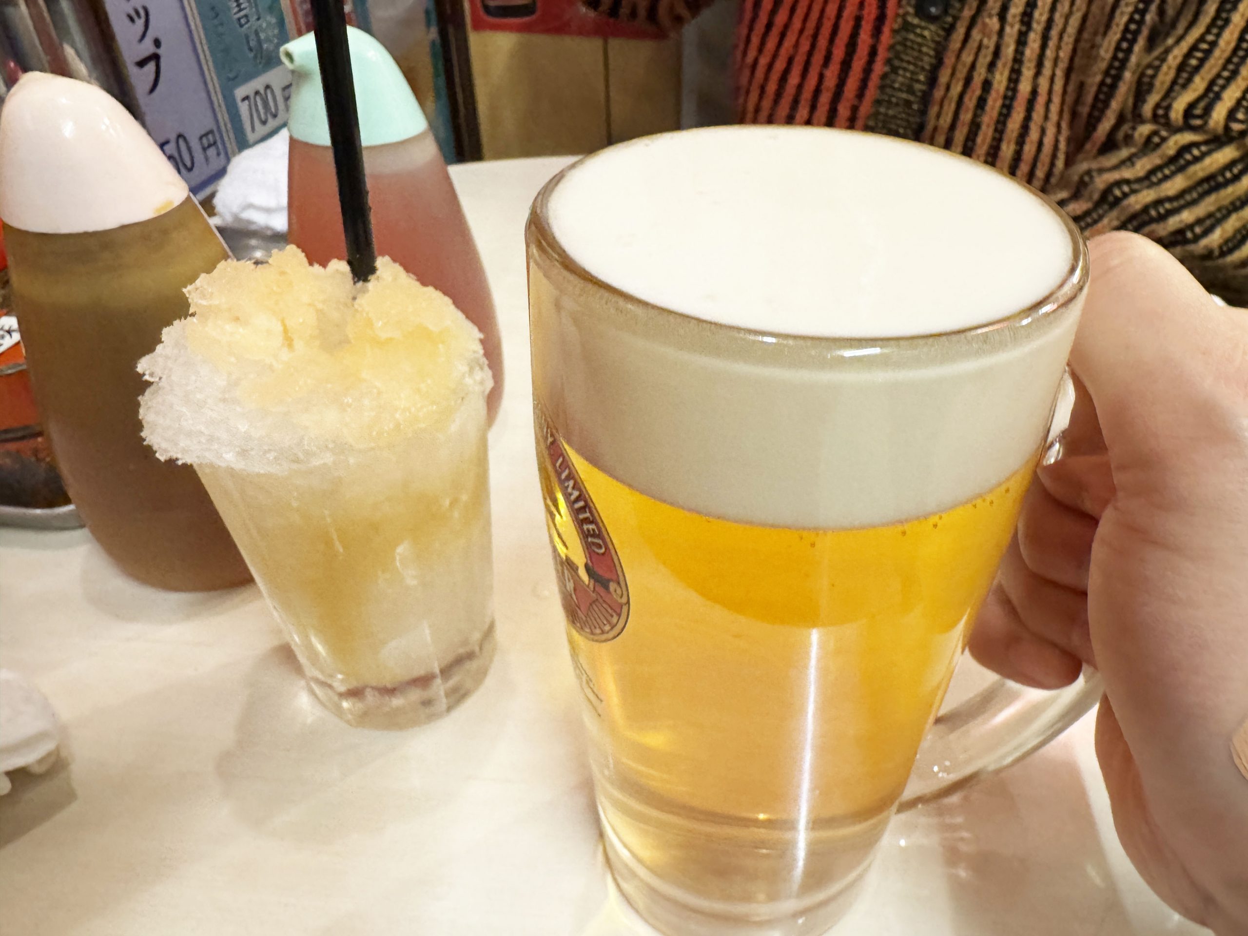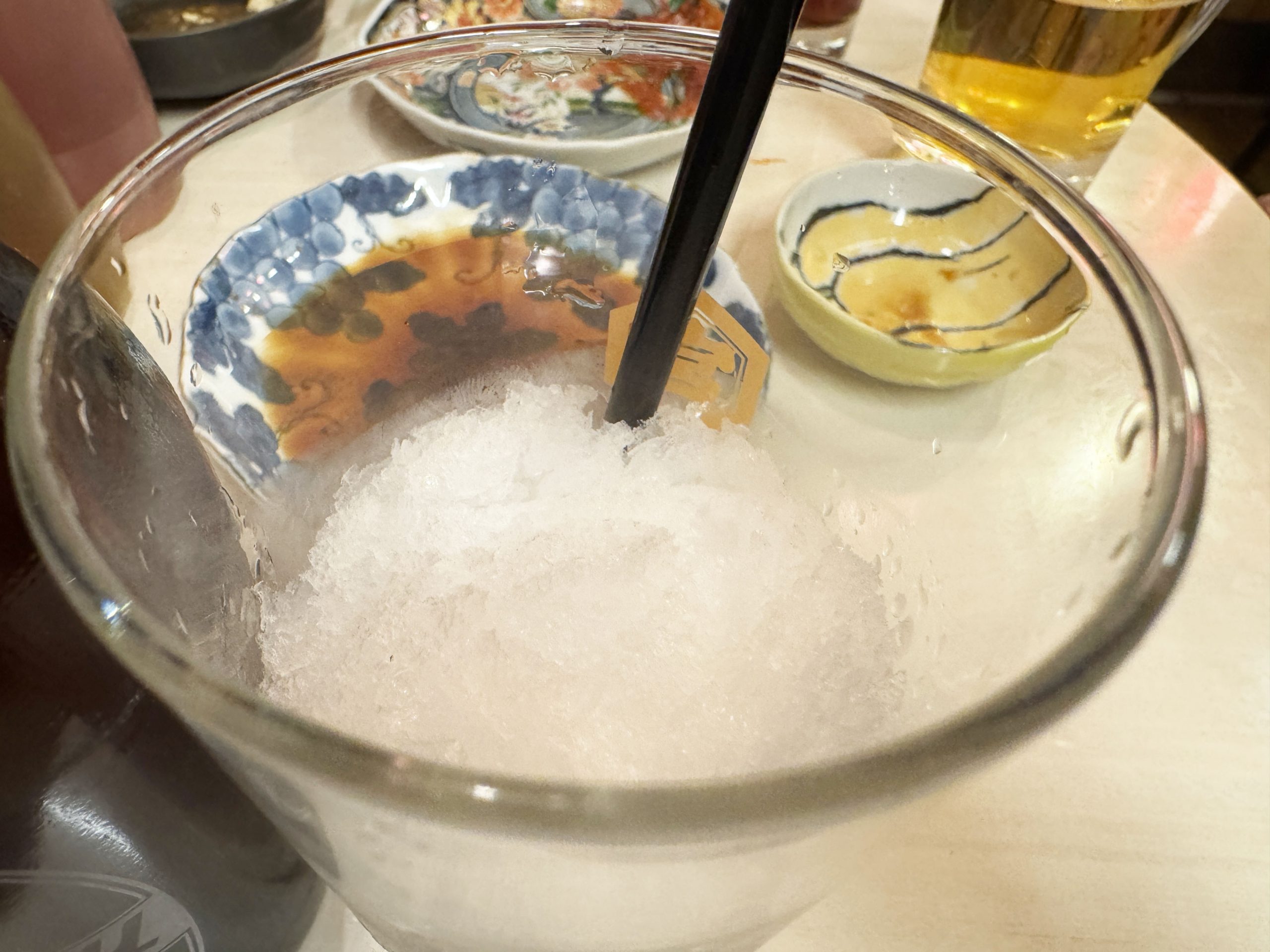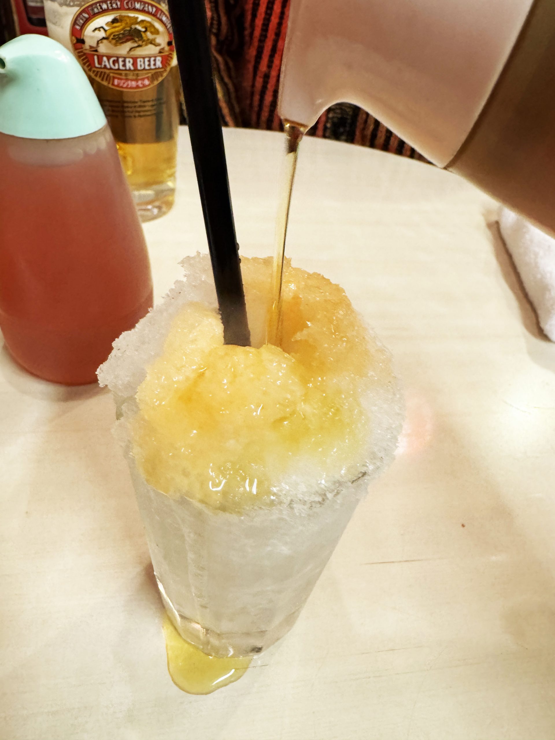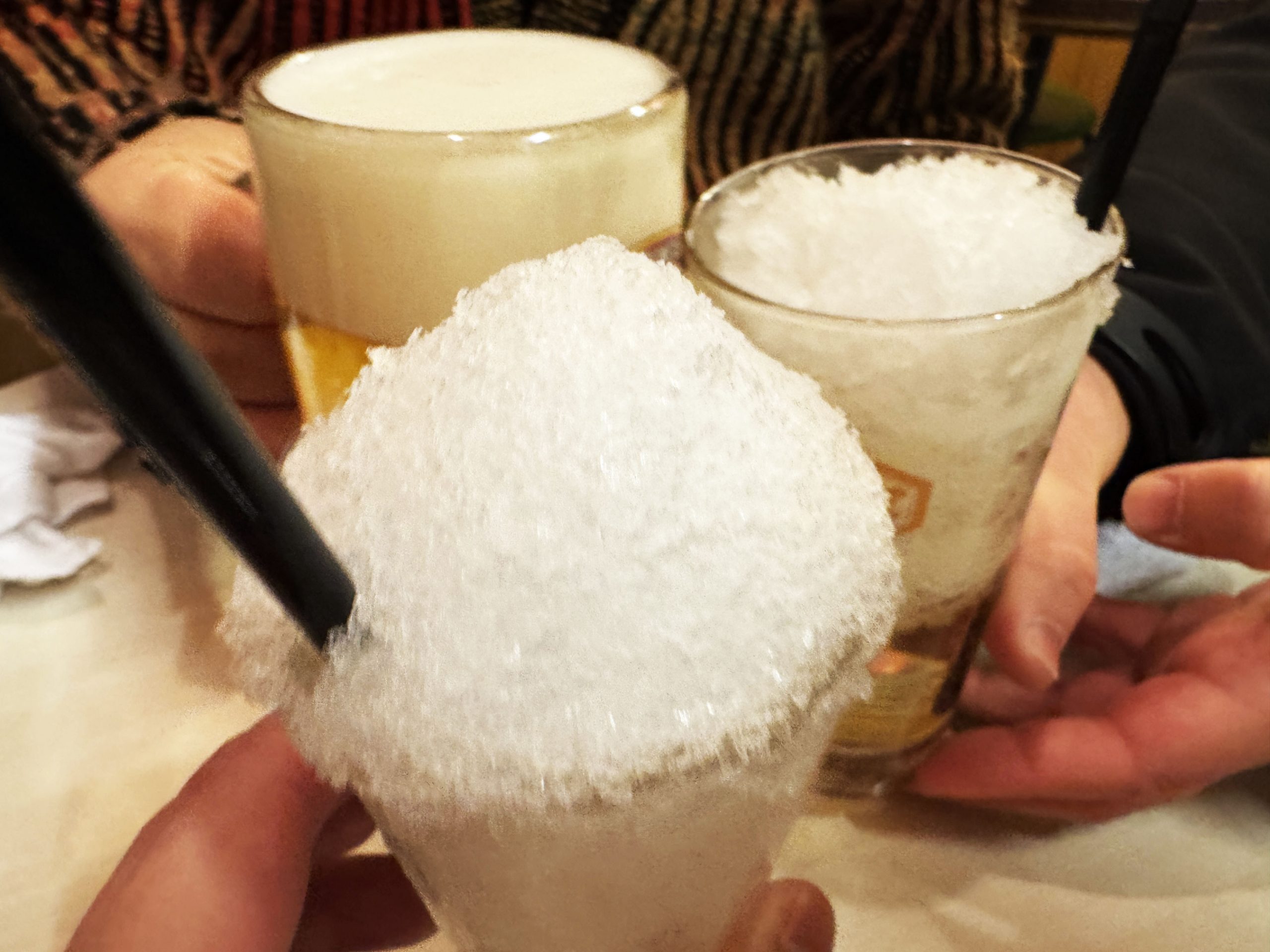 シャリキン(ナカ)にホッピー(ソト)を注いでも、凍っているのでなかなか浸透せず。