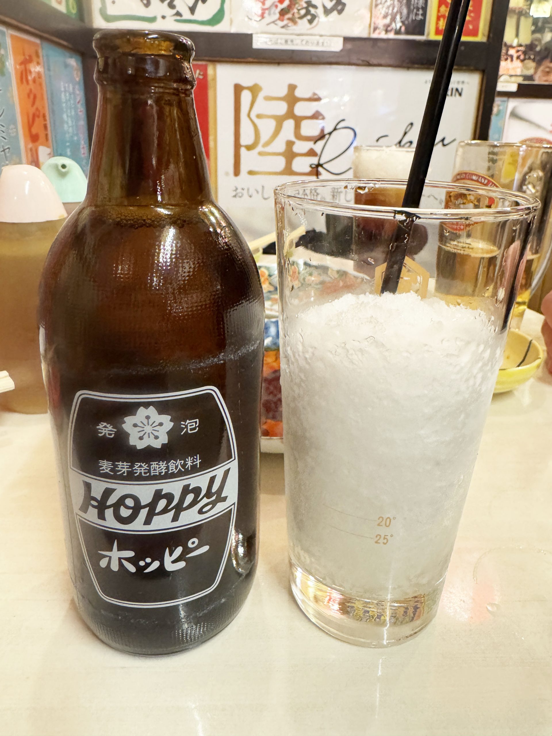 ホッピー(ソト)を注ぎながら飲めば、途中からシャーベットのような状態になって、これもまたおいしい。