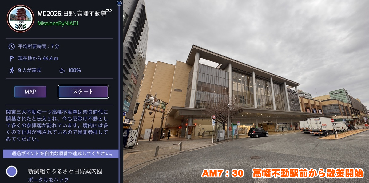 まずは、京王線の高幡不動駅の南口から始まる「MD2026:日野、高幡不動尊」というミッションを開始。