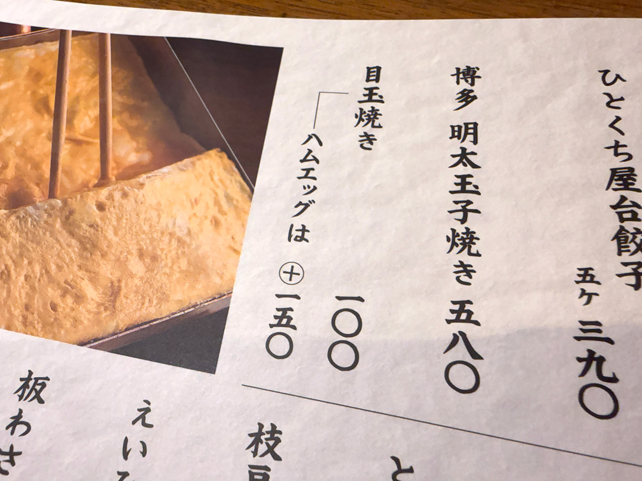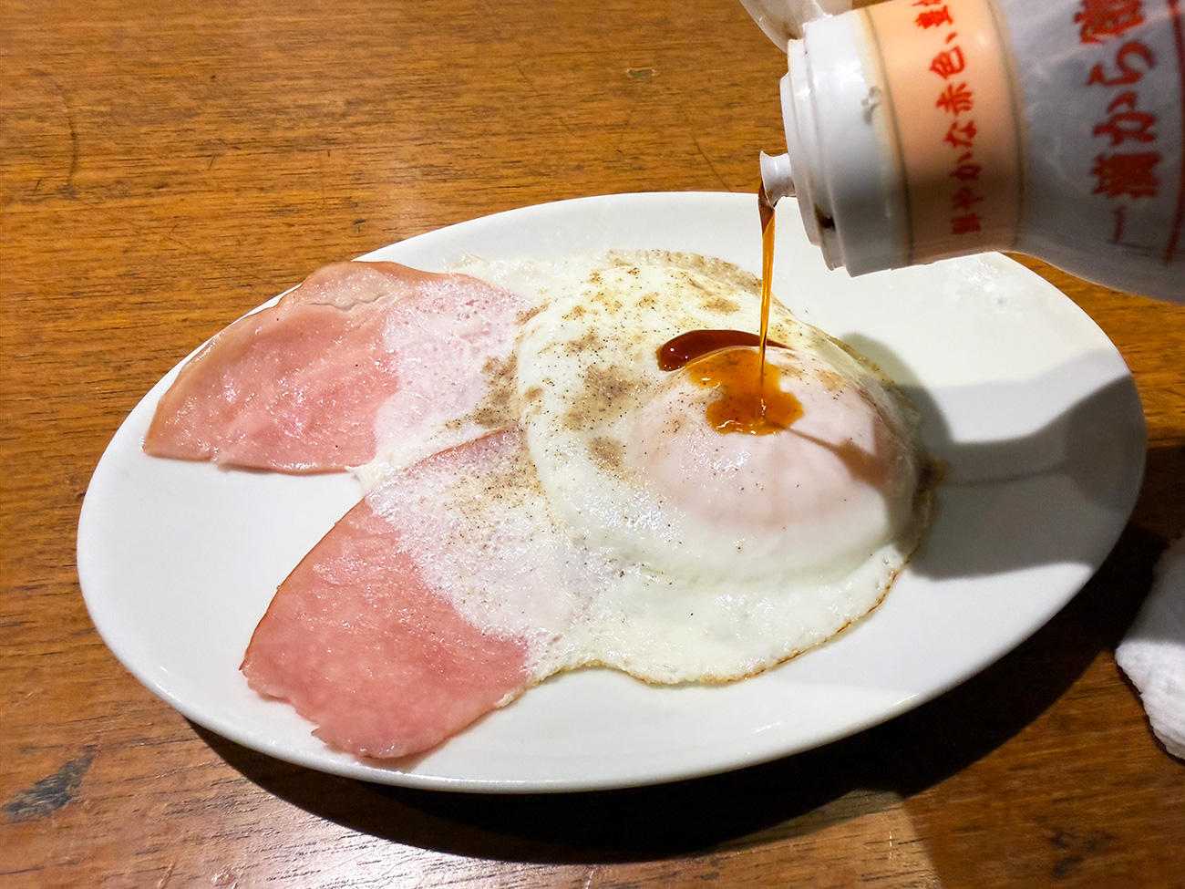 続いて100円の目玉焼きも注文。でもこのあと100円の煮卵を注文して卵かぶりさせちゃうのも……と思ったので、プラス150円でハムエッグにアップグレードしてみました。