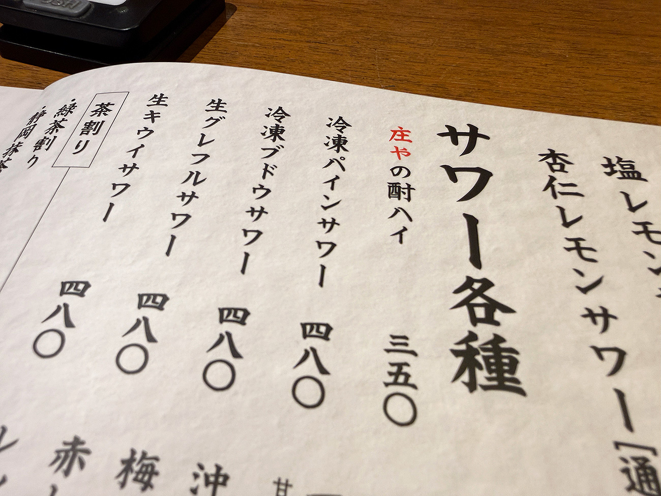 ひとまずドリンクは一番安いアルコールの「庄やの酎ハイ」(350円)を注文。そしてアルコール類を注文した時点でお通し代として350円も発生。合計700円。……うむむっ、いきなり結構使っちまったな……。