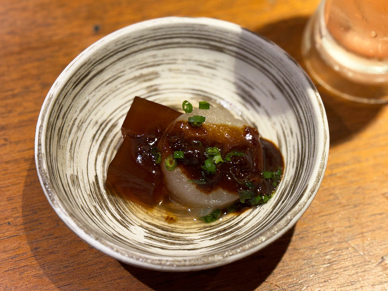 だしでじっくり煮込まれた大根に、濃厚な肉味噌がたっぷり。名古屋の味噌おでんのようでちょっと違い、肉の存在感がいい感じ。味噌テイストの煮凝りもジワッとウマい。これだけでいい感じでチビチビいけるんですよね。