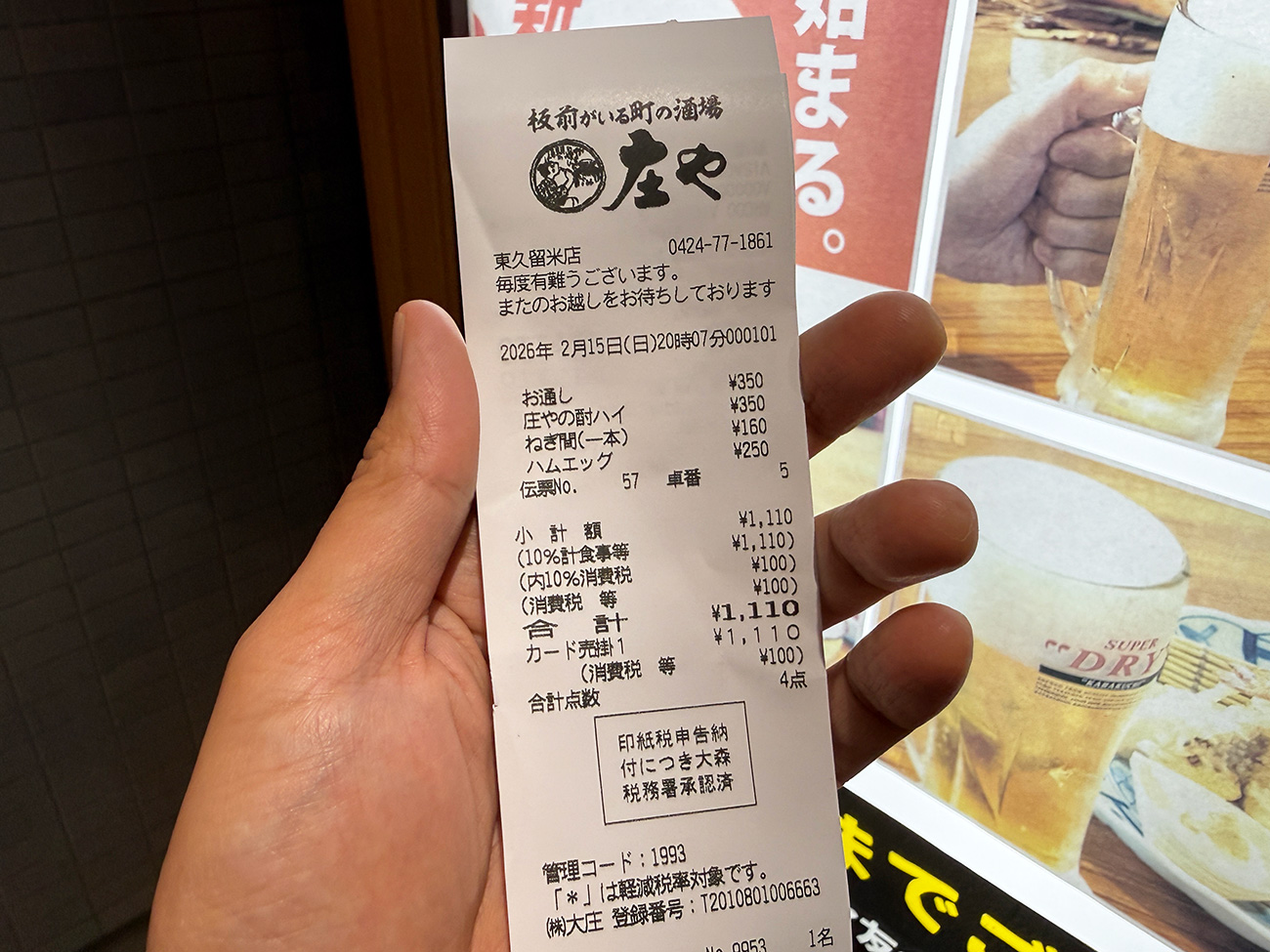 ここで金額は1000円を超えたのでこの日は打ち止め。庄やの酎ハイのサプライズもあり、1110円でかなり充実した気分で過ごすことができました。