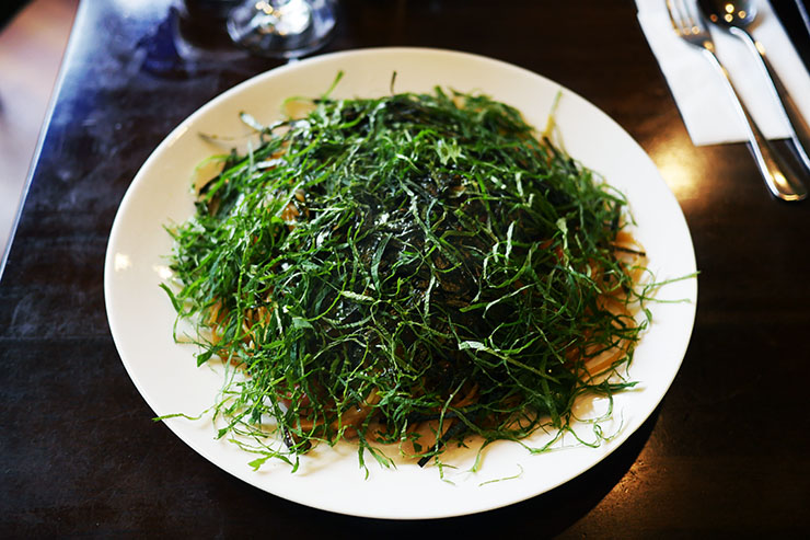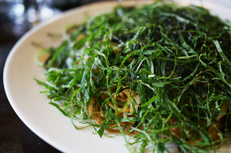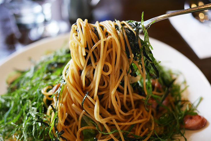 まず、スパゲティを完全に覆ってしまうほどの紫蘇(しそ)に驚かされる。丁寧に極細に切られた紫蘇が大量に盛られている。さすがプロの職人だなと感じるのが、紫蘇がふわっと盛られている点。湯気や湿気でベタッとしていないので、シャキシャキとした紫蘇の食感と風味が損なわれない。