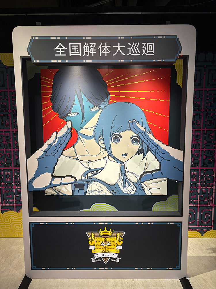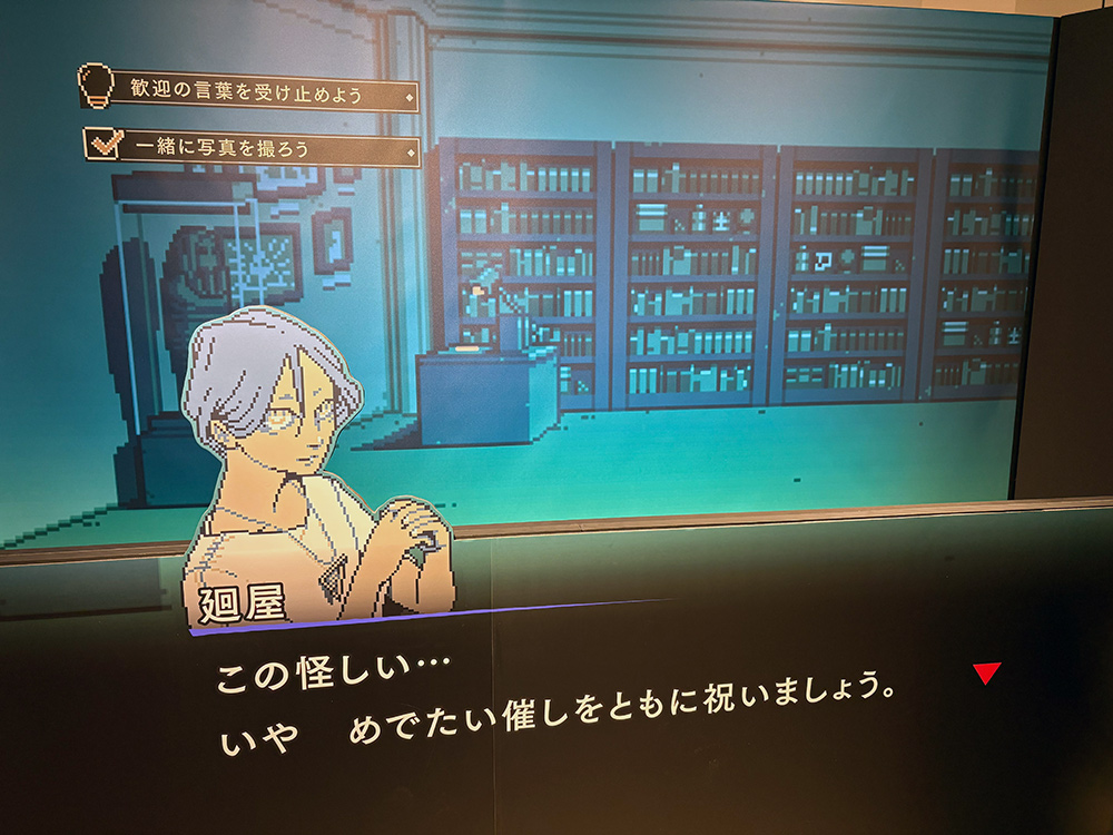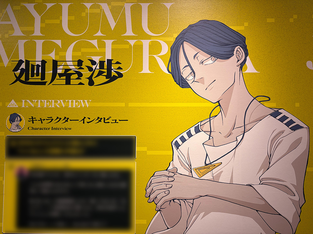 最初に見られるのが、「入れ替わりウェルカムメッセージ」。こちらは作中のキャラクターたちからウェルカムメッセージがもらえるフォトスポットとなっている。内覧会では廻屋渉ver.だったが、会期中は出迎えてくれるキャラクターが順次入れ替わるとのこと。じつに楽しみだ。