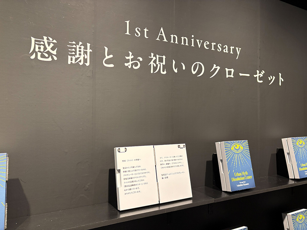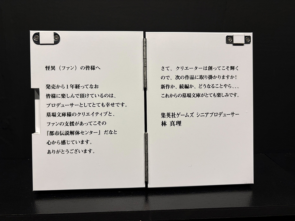 ユニークな仕掛けなのが、「感謝とお祝いのクローゼット」。こちらは壁面に飾られた”立体の本”を開くと、発売一周年を記念して、墓場文庫や林プロデューサーなどから来場者へ向けた感謝のメッセージが出現。全10冊あり、誰からメッセージが寄せられているかは、その目で確かめてほしい。