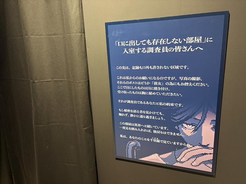 合言葉を言わないと入室できず、中は写真撮影・ネタバレ一切禁止。ゲームをエンディングまで見届けたプレイヤーだけが意味を理解できる、あの合言葉——わかる人にはわかる、あれを声に出してスタッフに伝えるという体験そのものが、すでに演出の一部になっている。