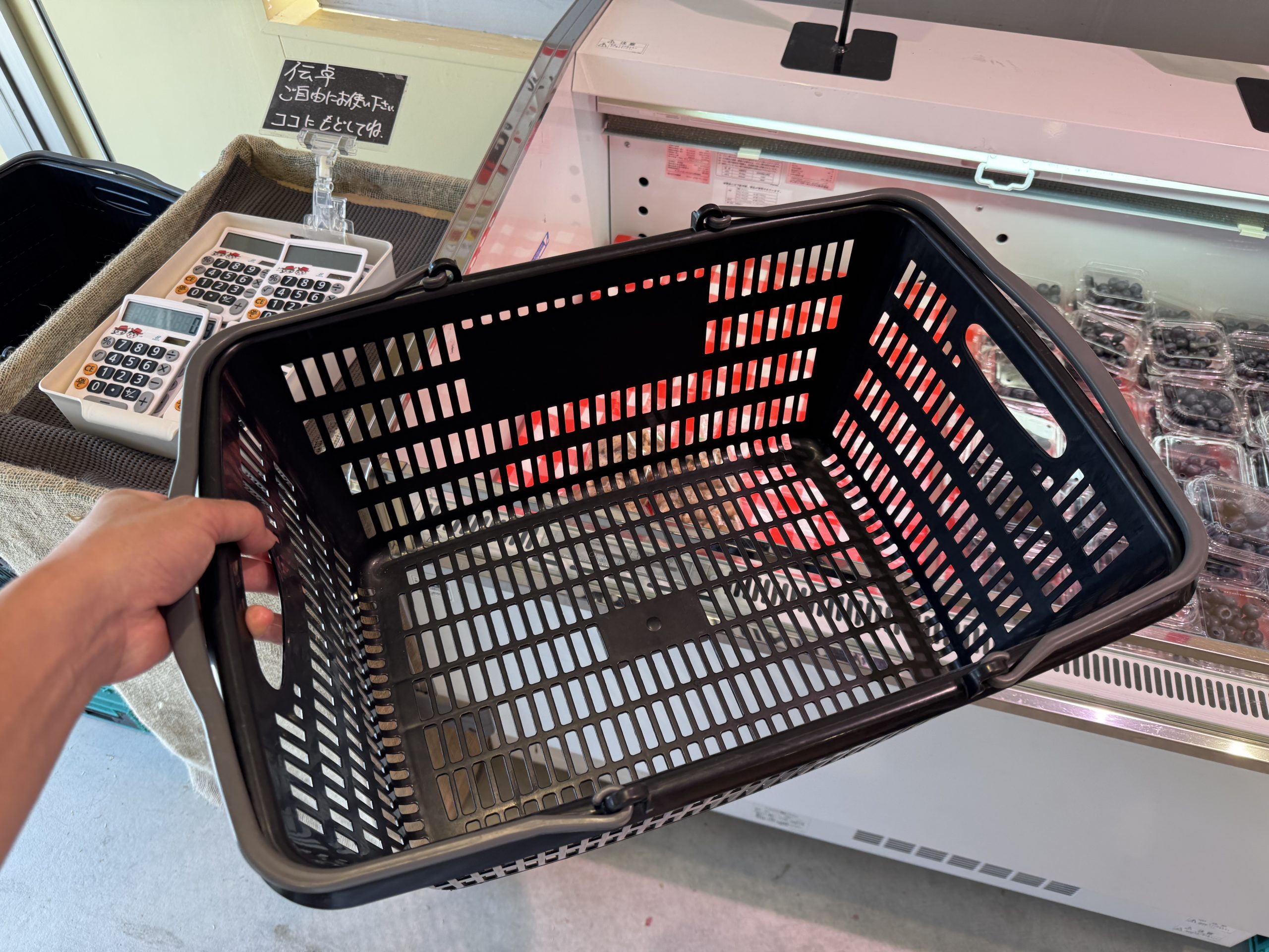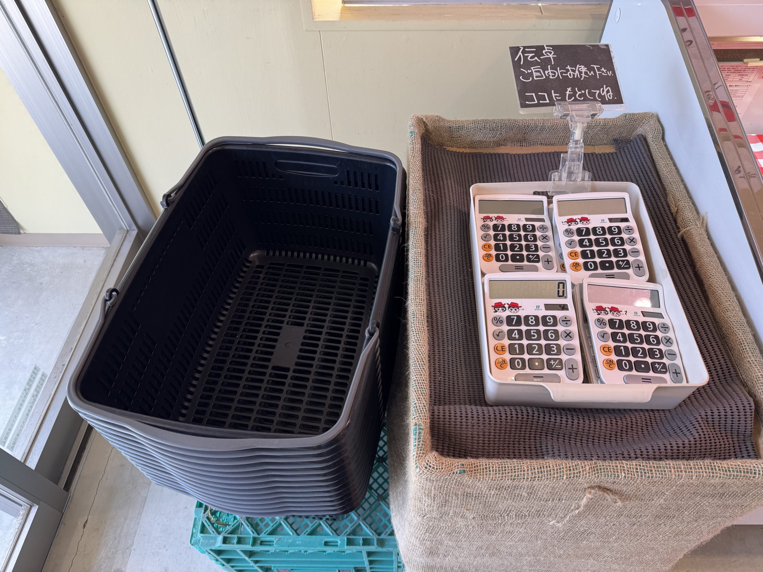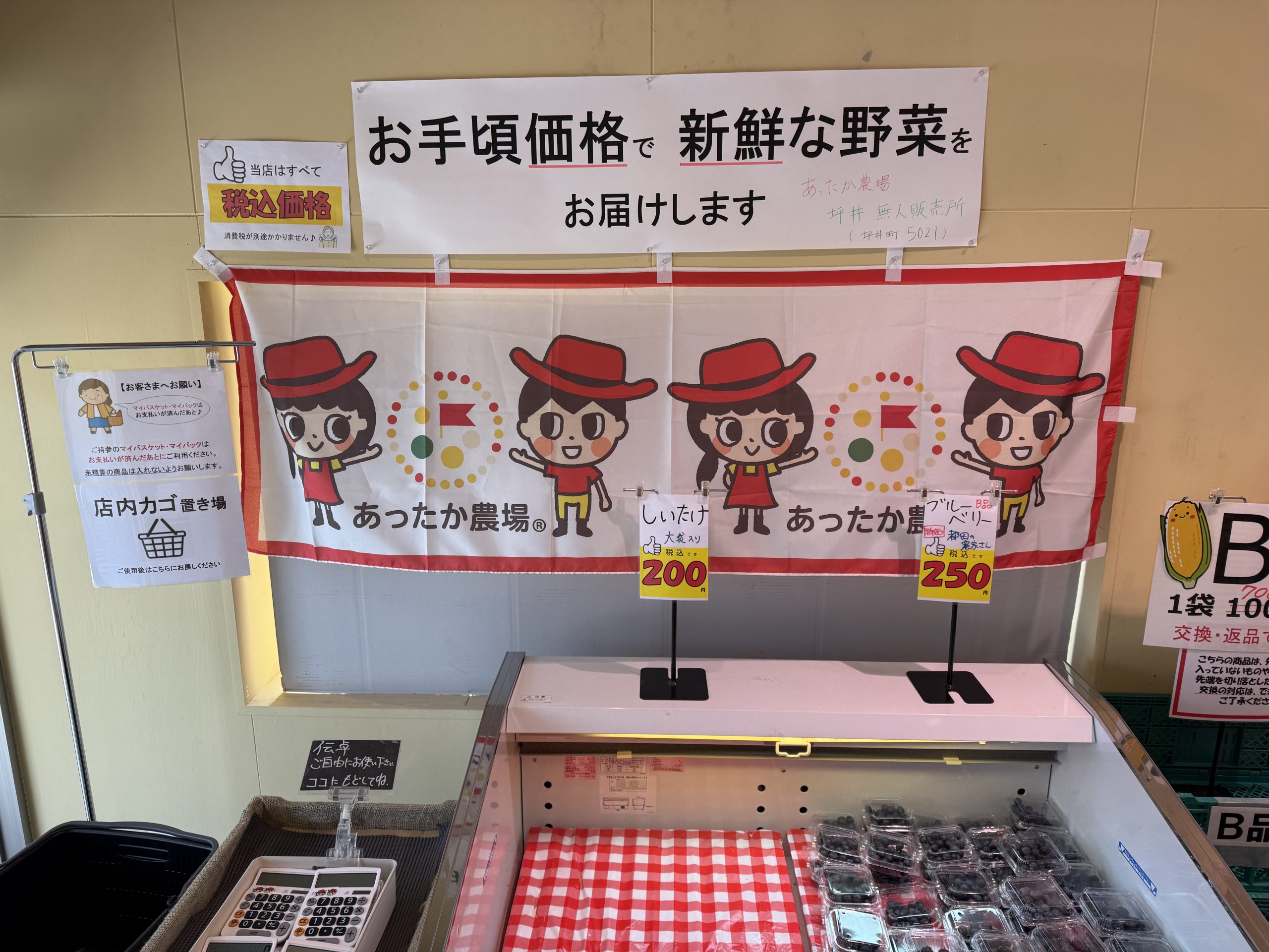ここ、用意された電卓で計算しながら野菜や果物を買う無人直売所。