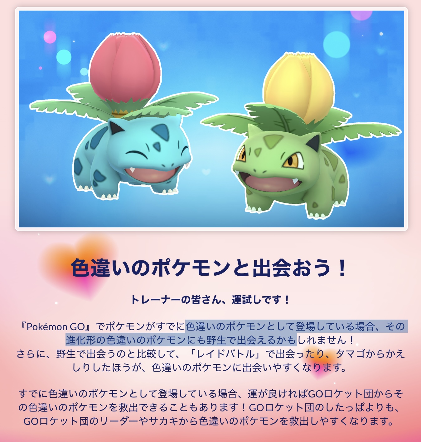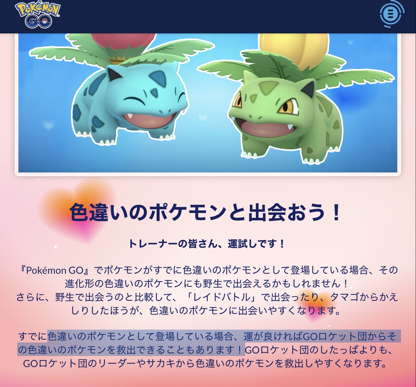 下部に「したっぱよりも、GOロケット団のリーダーやサカキから色違いのポケモンを救出しやすくなります」とあることから、したっぱのポケモン全種(色違い実装済みの)が対象になると読んで間違いなさそう。