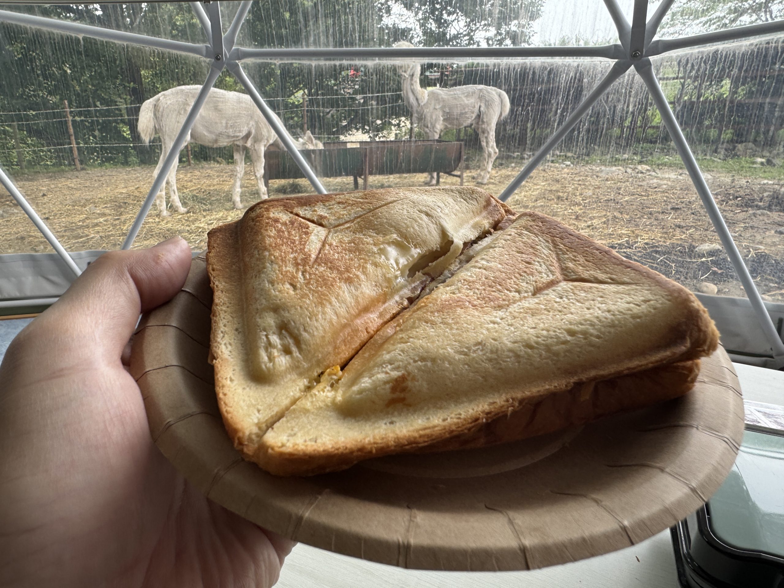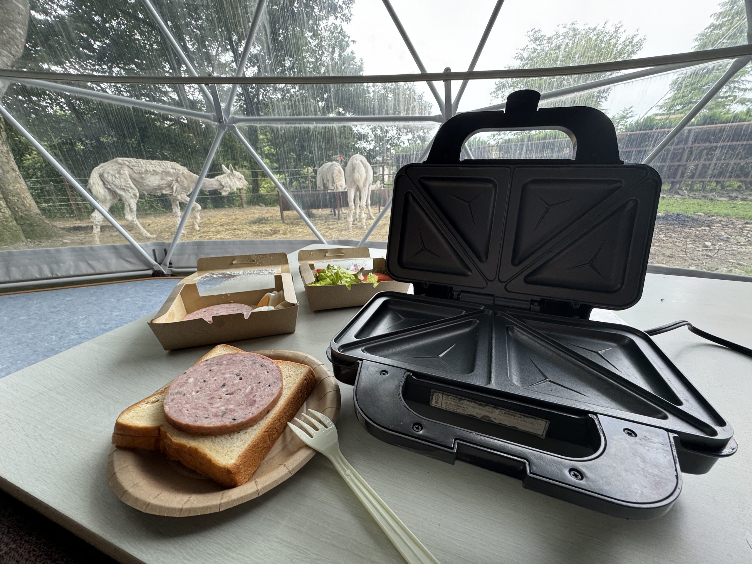 そして夜が明け、アルパカを眺めつつモーニングを食べました。