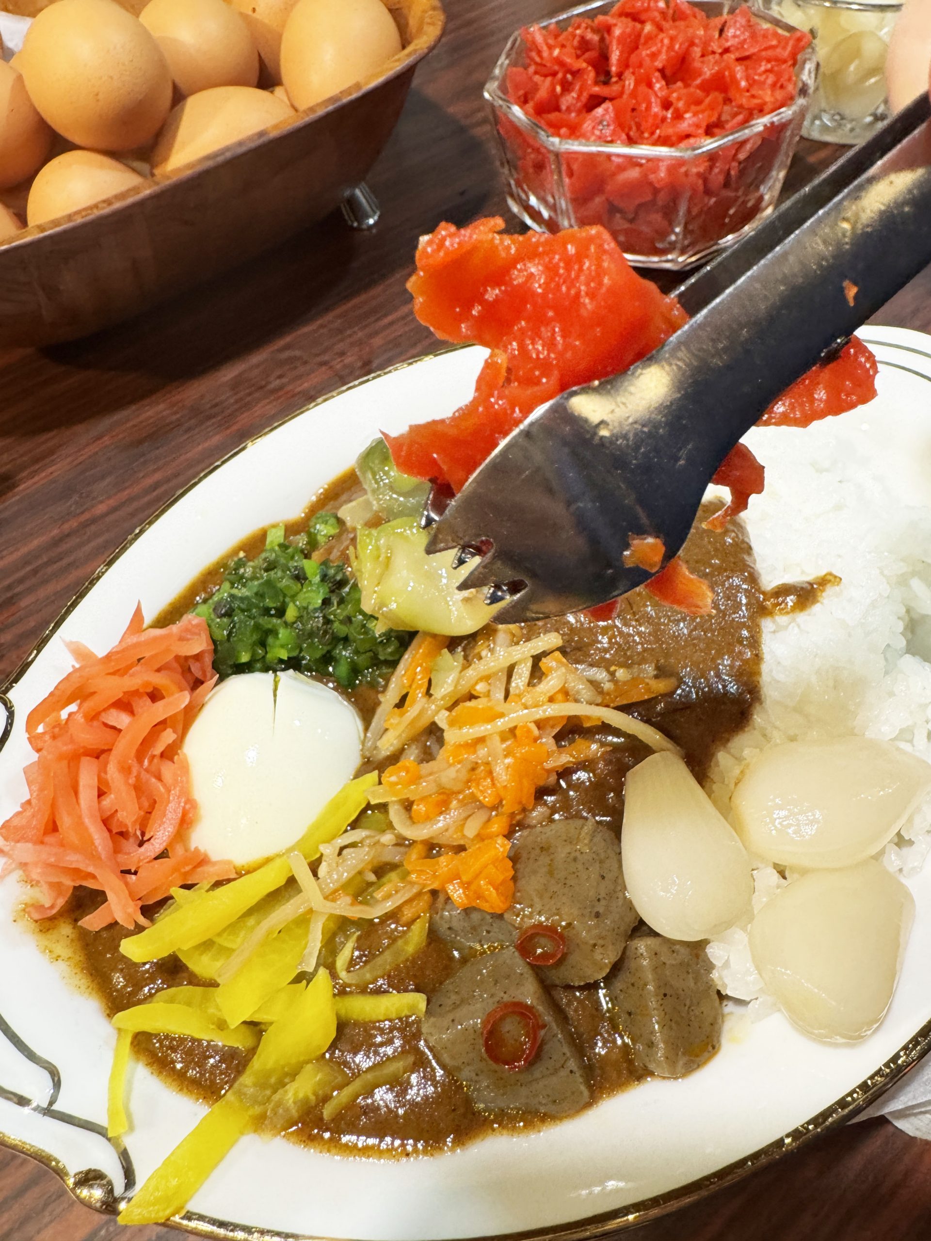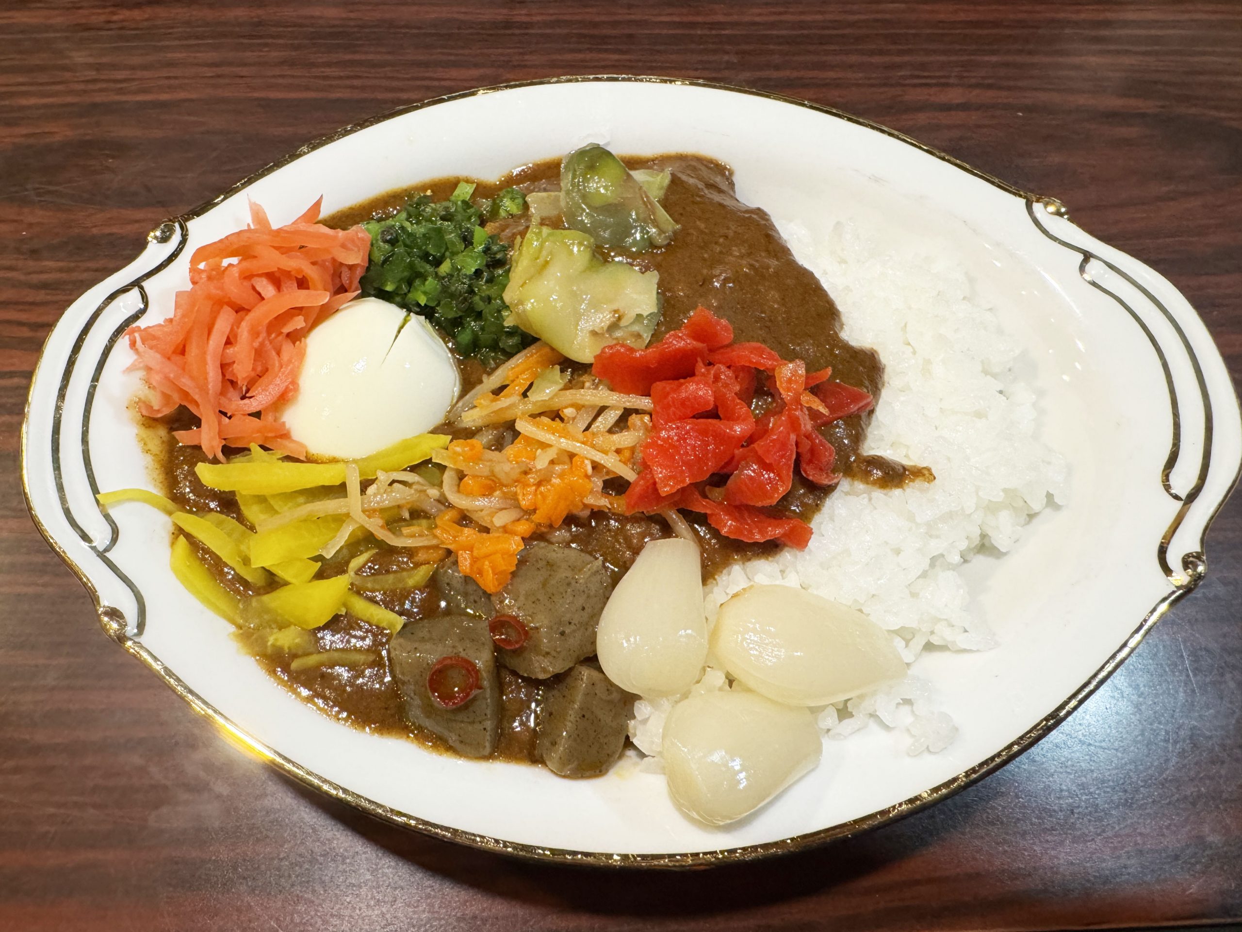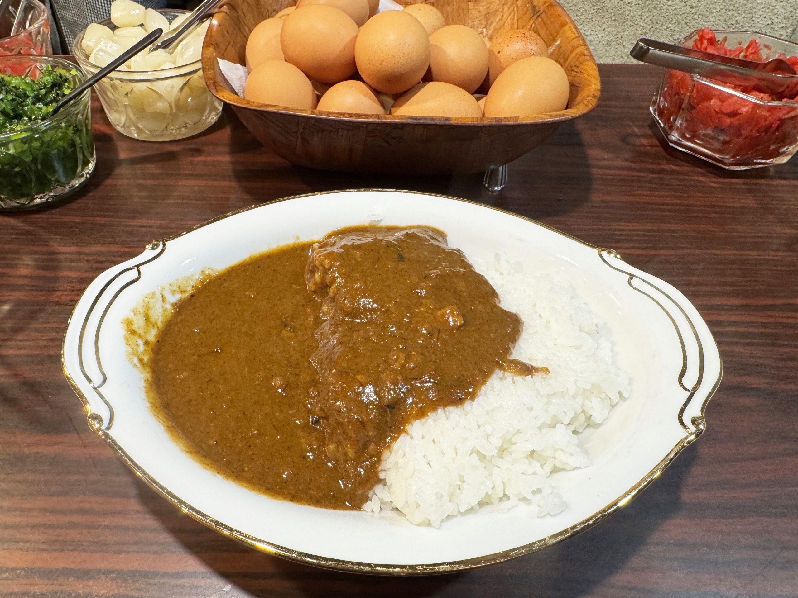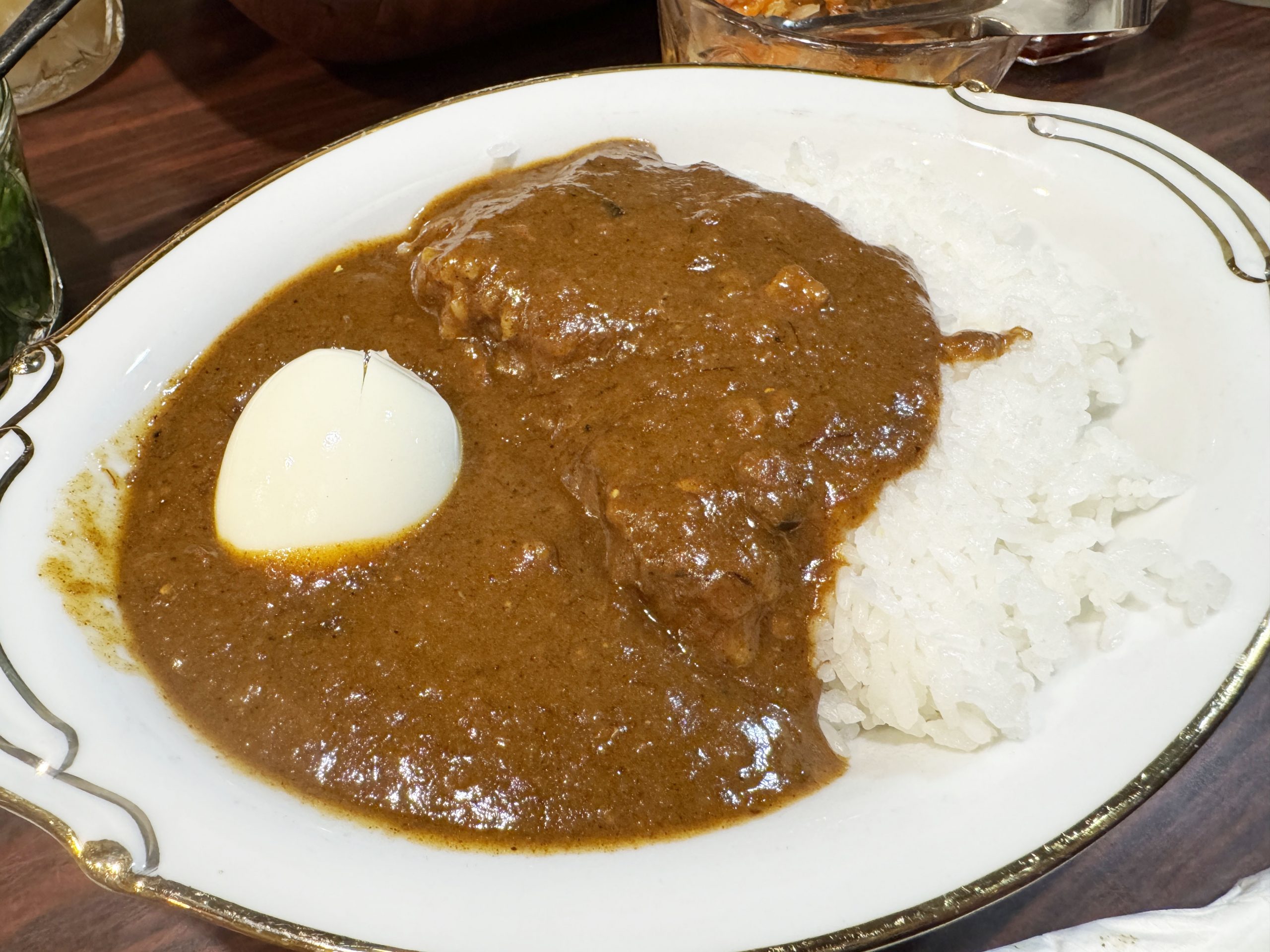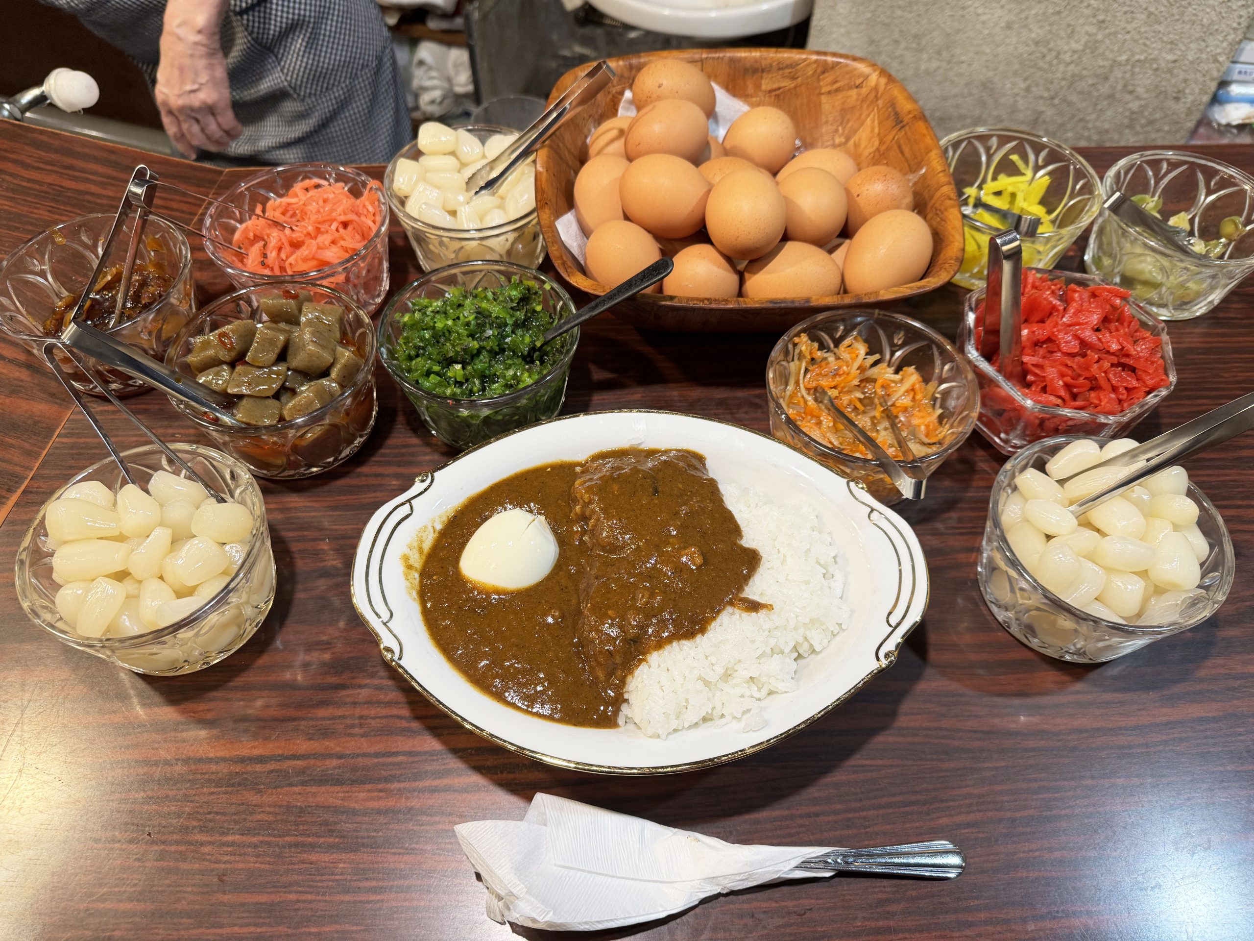 カレーを出したあと、女将さんがゆで卵を剥いて、カレーにのせてくれます。