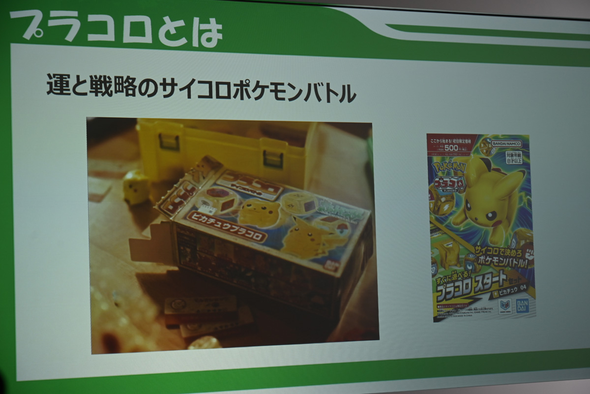 続いて登壇したのは企画担当の松浦由莉氏。「プラコロ」は1997年にバンダイから発売されたサイコロバトルホビーのリニューアル版だ。もともとはポケモンの石原恒和社長が発案し、クリーチャーズが設計、バンダイが製造・販売を担ったタイトル。今回はその当時のチームが再結集し、ポケモン30周年にあわせて”本気のアップデート”を施したという。