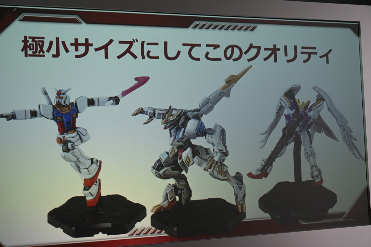 ミニチュアは接着剤不要のスナップフィットで、パーツ数も最小限。「遊ぶまでの距離を極限まで短縮した」と染谷氏は語る。単色成形ながら劇中の印象的なポーズを立体化し、置くだけで陰影が際立つ造形は、さすがのガンプラ品質。塗装すれば世界に1体だけの自分のMSが完成する。