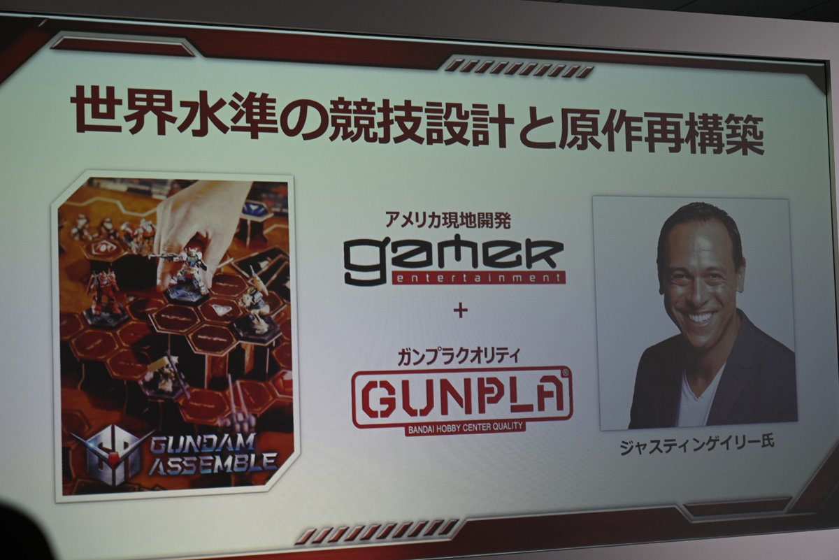 ゲームデザインの中心にいるのが、デッキ構築ボードゲーム「アセンション」の開発者であるジャスティン・ゲイリー氏。染谷氏いわく「PCGの世界大会での優勝経験を持つレジェンド」とのことで、先行するミニチュアゲームを徹底分析した上で、現代のプレイヤーが求めるテンポの良さと”ガンダムらしさ”の両立を追求したそうだ。