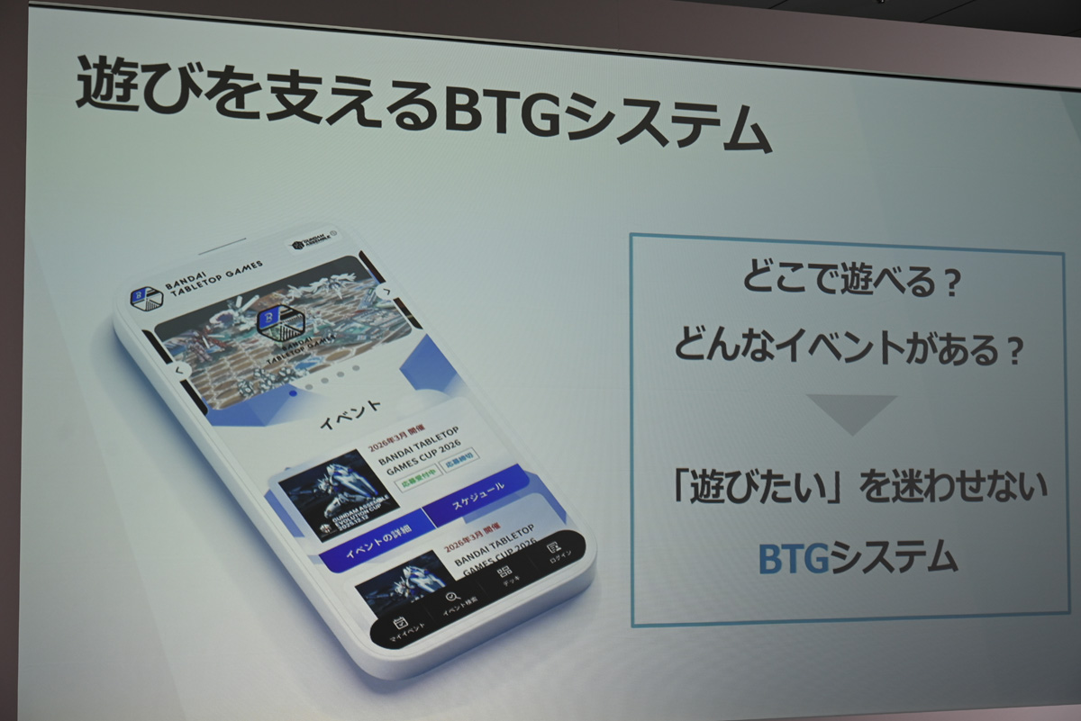 発表会の終盤では、国内マーケティング部の清水浩史氏が登壇。公式プラットフォーム「バンダイテーブルトップゲームズ(BTG)システム」の概要を説明した。イベント検索からエントリー、対戦結果の記録までをブラウザ上で完結できる仕組みで、TCG事業で実績のある「TCGプラス」のノウハウを応用しているとのこと。