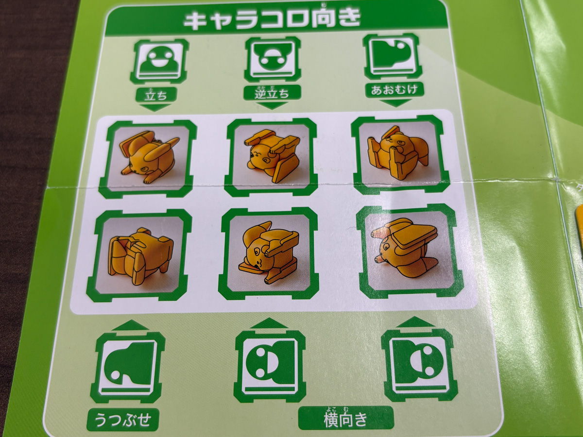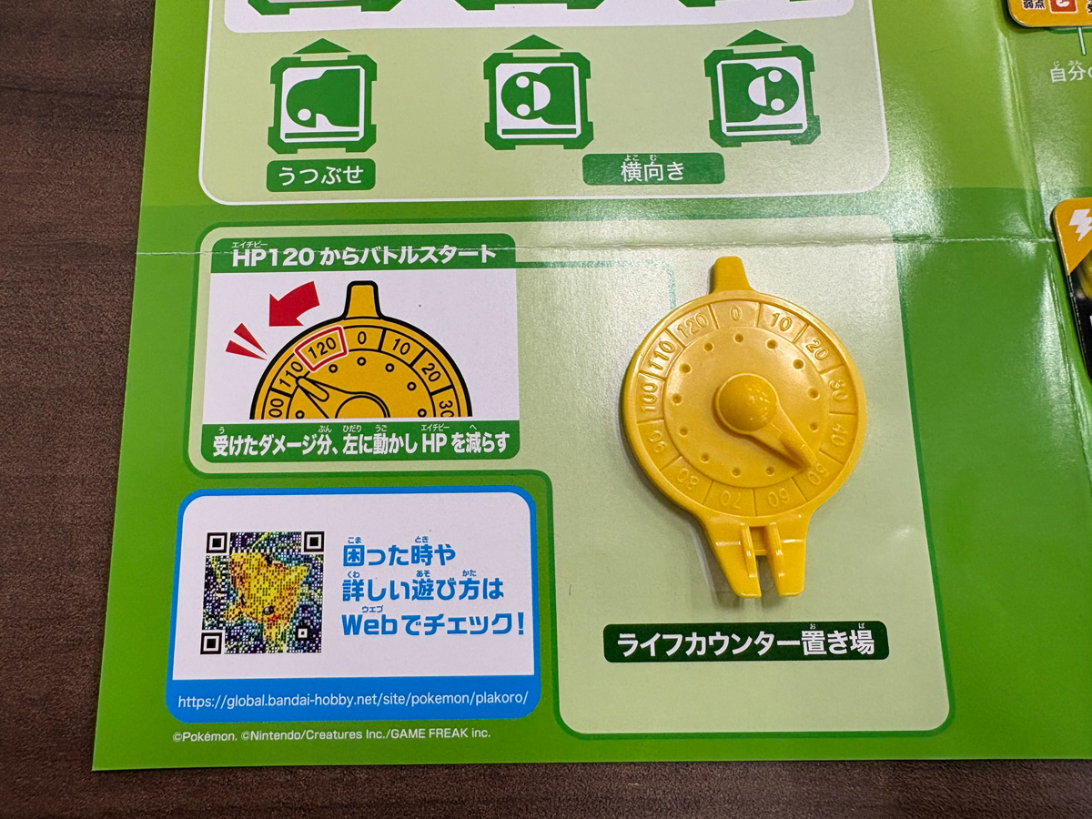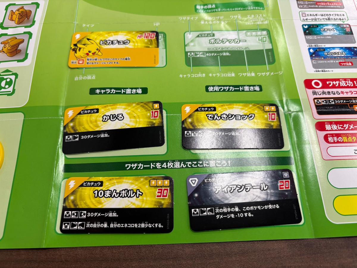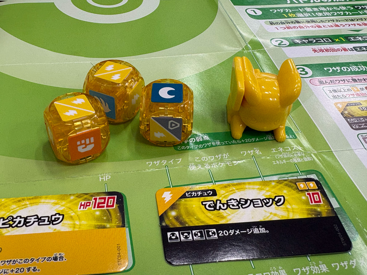 基本の流れはこう。手持ちの7つのワザから4つを選んでセットし、そのうち1つを宣言。ポケモン型サイコロ「キャラコロ」とエネルギーサイコロ「エネコロ」3つをまとめてコロコロ。エネコロの出目がワザに必要な条件を満たせばワザ発動、さらにキャラコロの向き(正位置・うつぶせ・逆立ちなど)で追加効果が乗る、という仕組みだ。