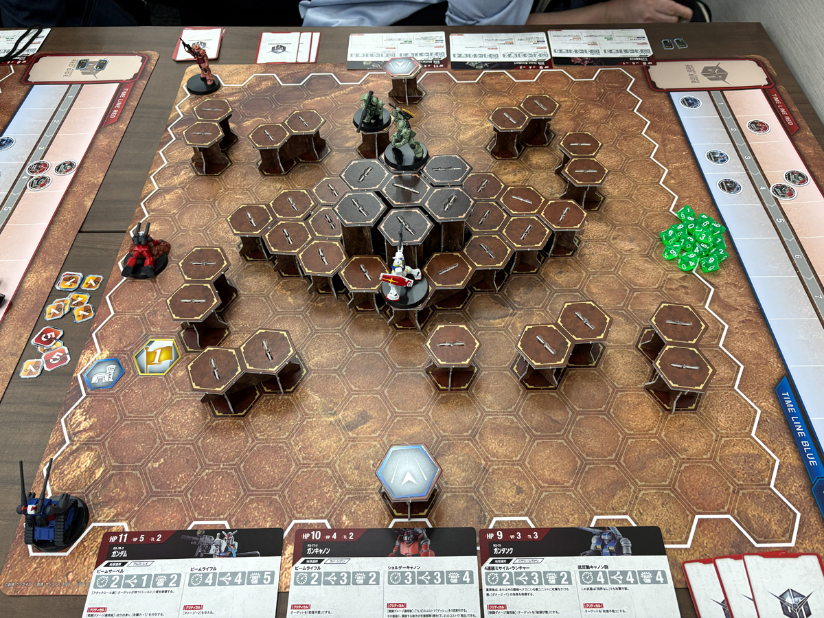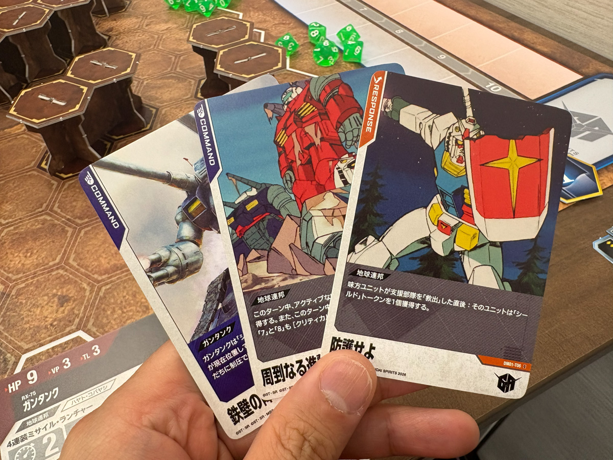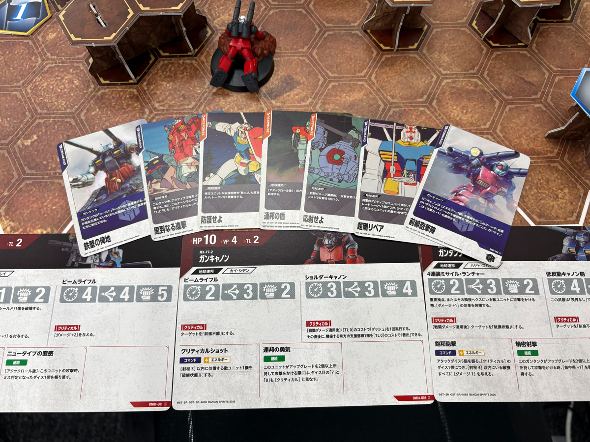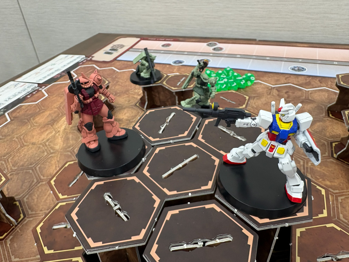 理由はシンプルで、『ガンダム』というよく知っているIPだからこそ、ルールがスッと入ってくるのだ。たとえば「ガンダムのビームライフルは障害物があると射線が通らないから撃てない」と言われれば、ガンダムファンなら「まあそうだよね」と直感的に納得できる。一方で「ガンタンクの低反動キャノン砲は山なりに飛ぶから障害物を越えて撃てる」と聞けば、「なるほど、ガンタンクだからね」と腑に落ちる。ガンダムの作品知識がルール理解の近道になるという構造は、実によくできていると感じた。