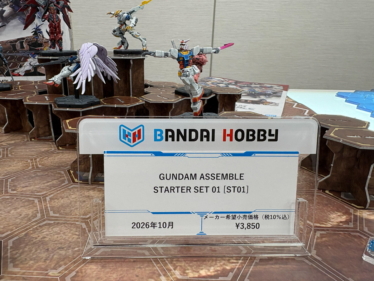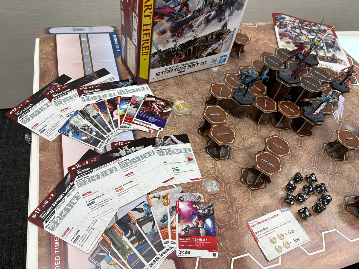 スターターセットにはRX-78-2 ガンダム、シャア専用ザク、ウイングガンダムゼロ(EW)、ガンダムエピオン、ガンダム・バルバトスルプスレクス、ガンダム・ヴィダールの6体が収録され、これに各種カード、10面ダイス、ゲームマップ、紙製テレインが付属して3,850円(税込)。まずは手に取りやすい価格で裾野を広げ、拡張セットでコンテンツを継続させる戦略とのこと。