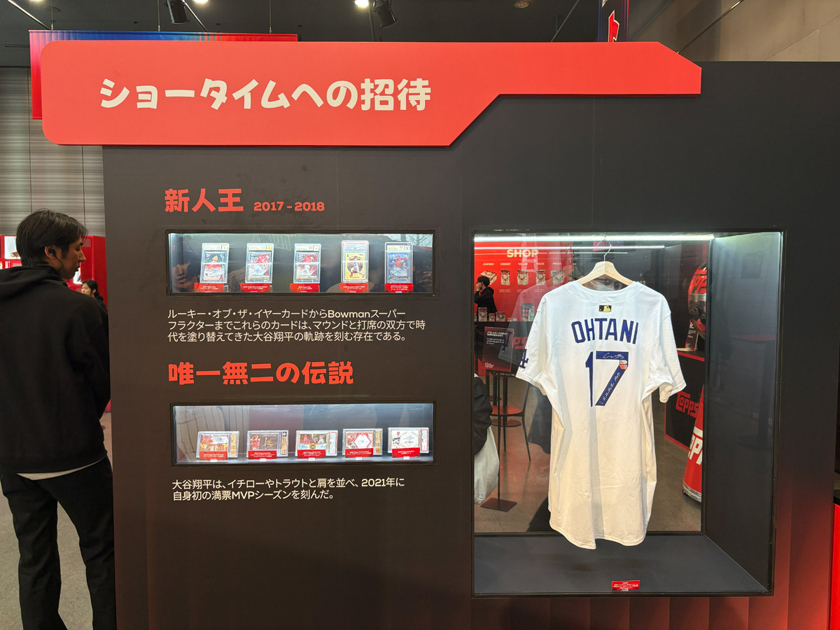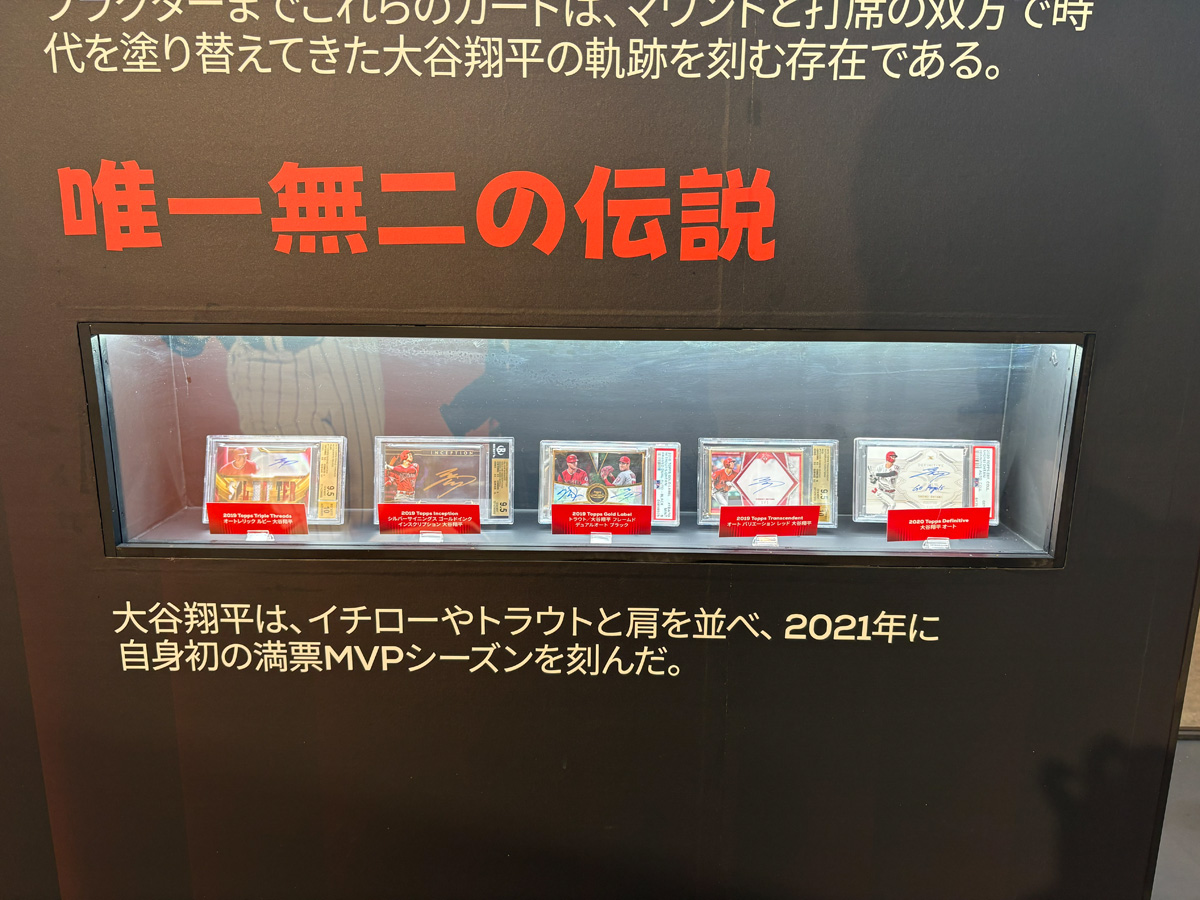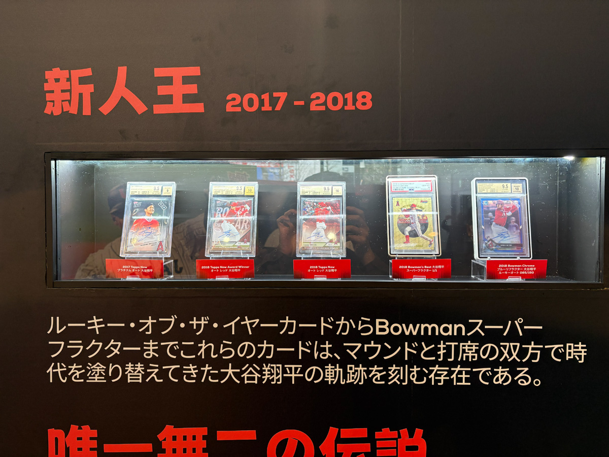 中でもたまらないのが、大谷翔平選手のキャリアを辿る特設展示だ。LAエンゼルス加入時のルーキーカードから始まり、メジャーリーグでの軌跡を時系列で追える構成になっている。Yoo氏は「後でぜひじっくり一枚一枚ご覧になってください。コレクターの方々からお借りした、とても貴重なカードばかりです」と語る。