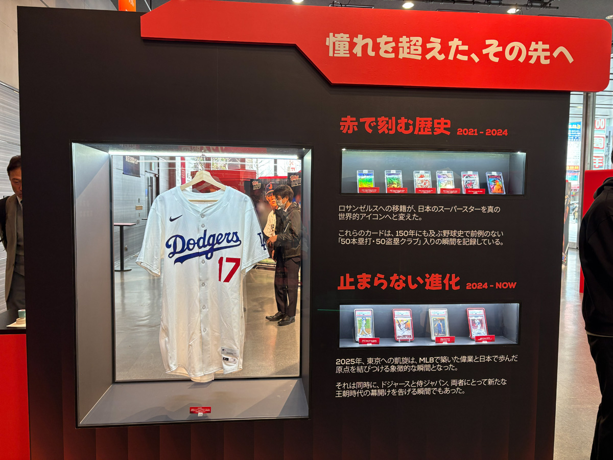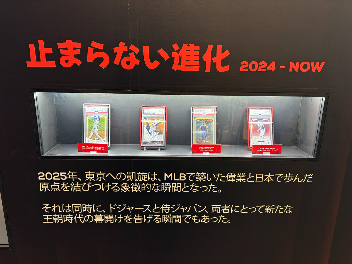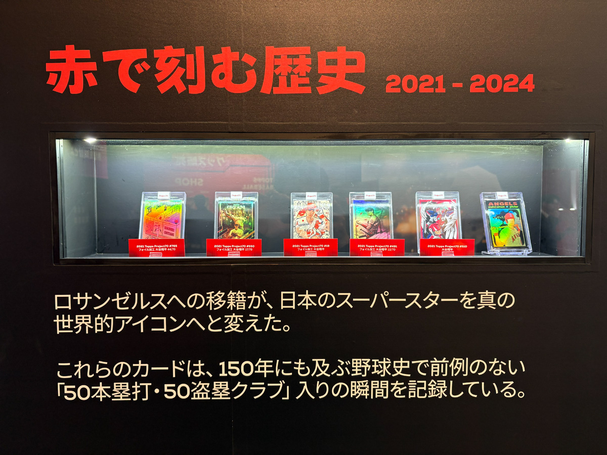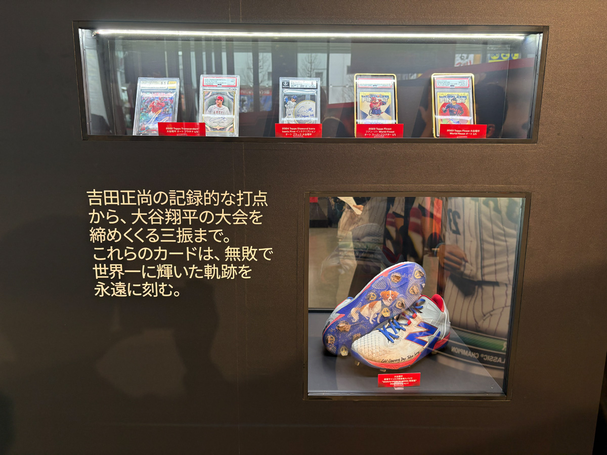 中でもたまらないのが、大谷翔平選手のキャリアを辿る特設展示だ。LAエンゼルス加入時のルーキーカードから始まり、メジャーリーグでの軌跡を時系列で追える構成になっている。Yoo氏は「後でぜひじっくり一枚一枚ご覧になってください。コレクターの方々からお借りした、とても貴重なカードばかりです」と語る。