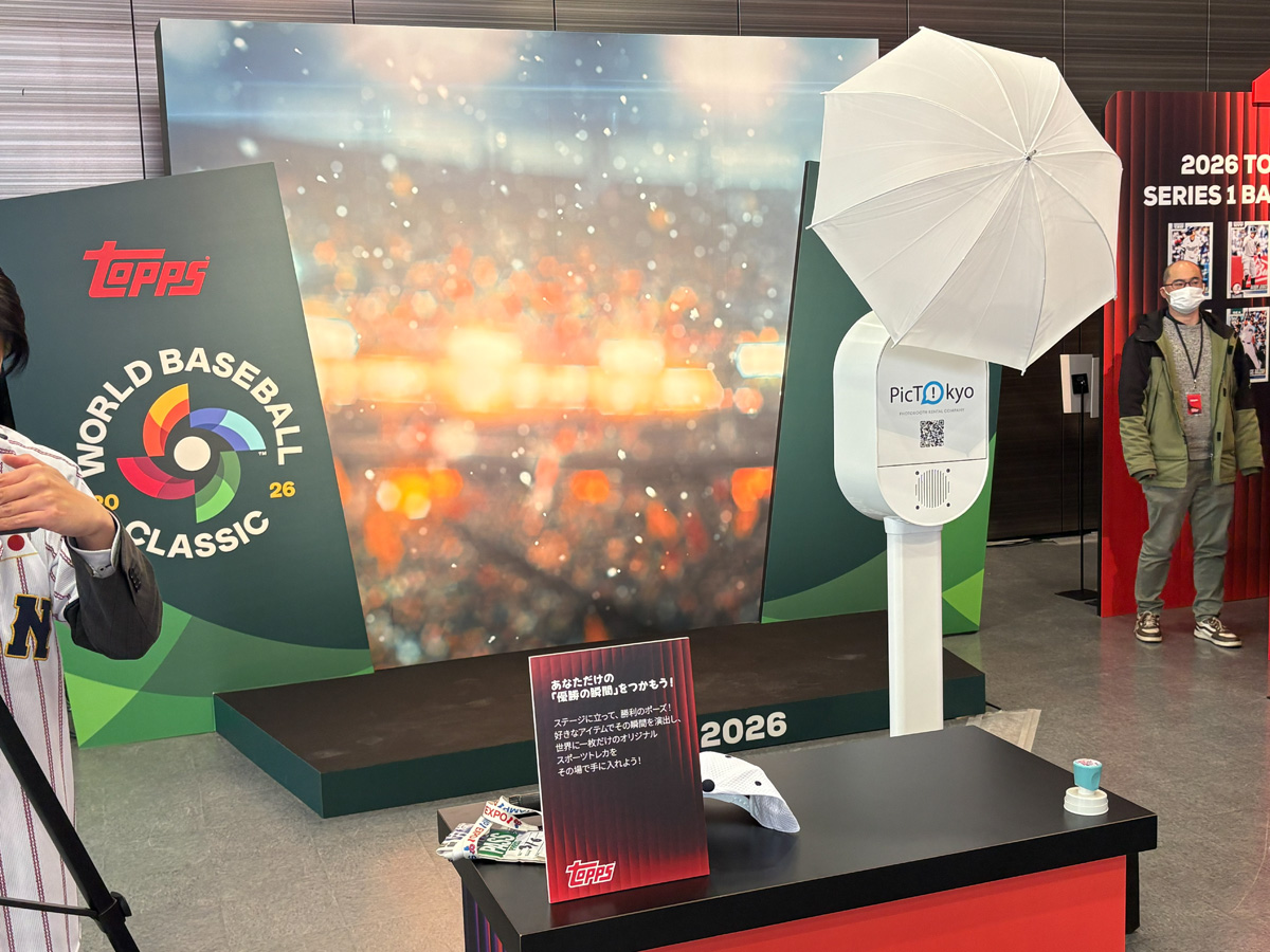 先述の「ブレイキング」を実際に体験できるライブイベントも翌日16時から実施予定で、その模様はYouTubeでも配信されるという。あの300万ドルカードが見つかった仕組みを自分の目で見られるチャンス、気になる方はぜひ。フォトブースでは「Make Your Own Card」として自分だけのToppsカードを作成できる体験も用意されていた。自分がトレカになれるなんて、これは結構うれしい。