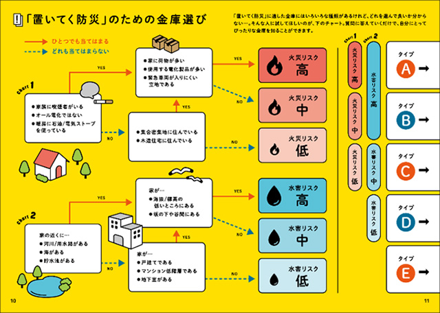 リスクに応じた「置いてく防災」実践のため、自宅のリスク診断やリスクに応じた金庫選びのチャートも掲載している。