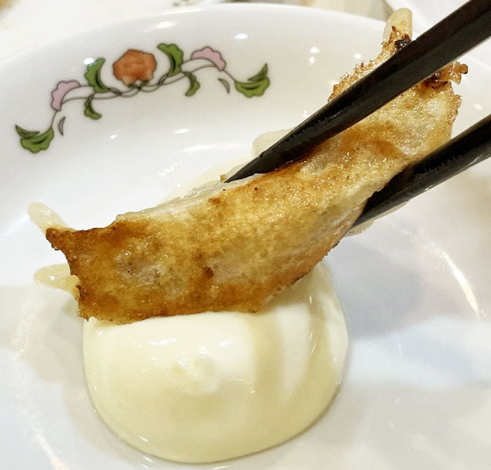 実は、マヨネーズを使った美味しい食べ方があります。餃子の断面からたっぷりと御酢を注ぎ入れ、マヨネーズをつけて食べるという方法です。これ、極めて酸味が豊かで最高。餃子のおいしさがグンと引き立ちます。