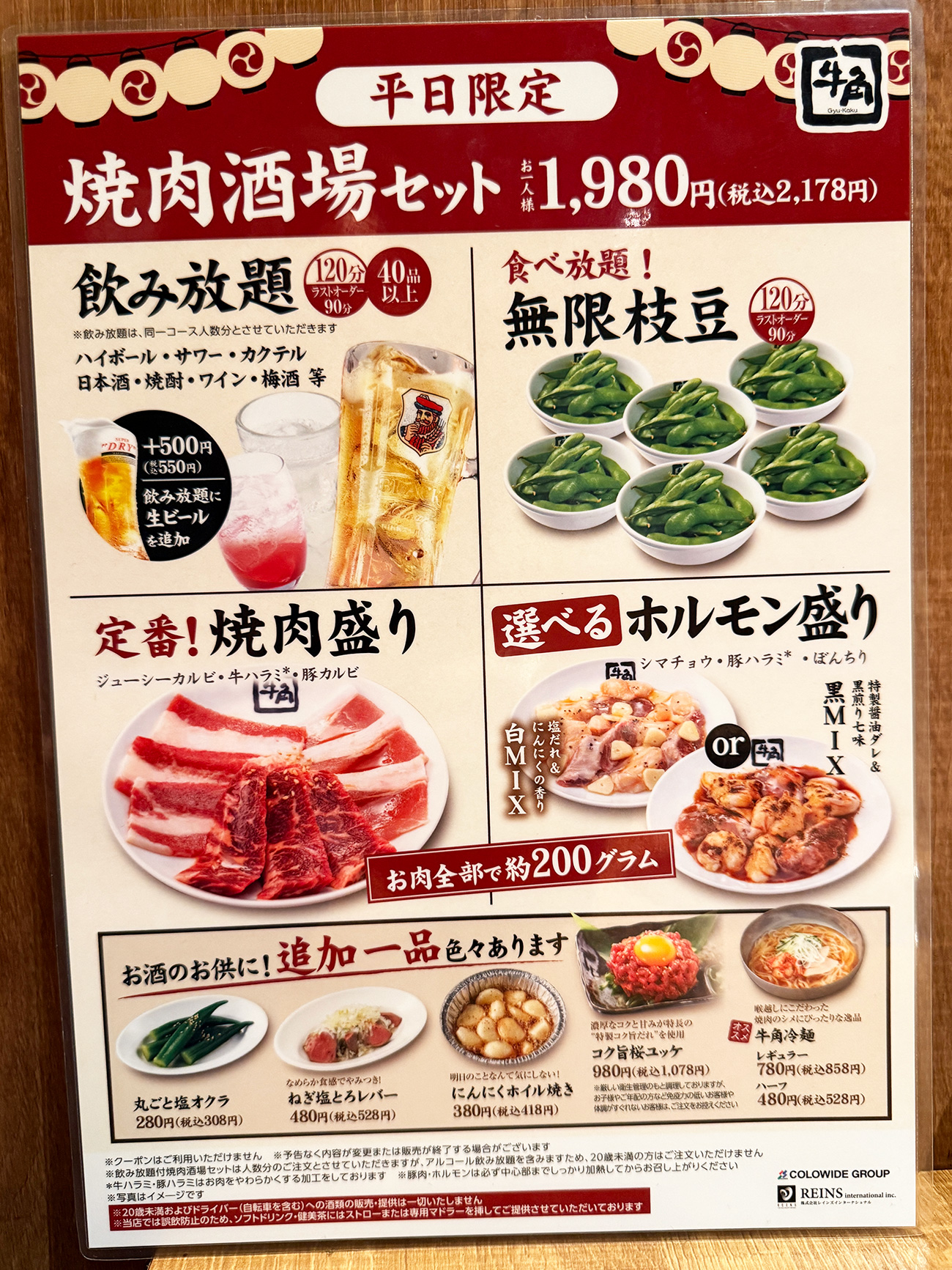 プラス500円で飲み放題に生ビールを追加したり、追加メニューのオススメなんかもありましたが、「俺は2000円以下で焼肉酒場してえんだ」と提案をすべて断り、デフォルトのセットを堪能していきます。ちなみに1,980円は税抜価格で、税込だと2,178円になるのは要注意。千円札2枚だけ握りしめて店に入っても焼肉酒場セットは注文できません。