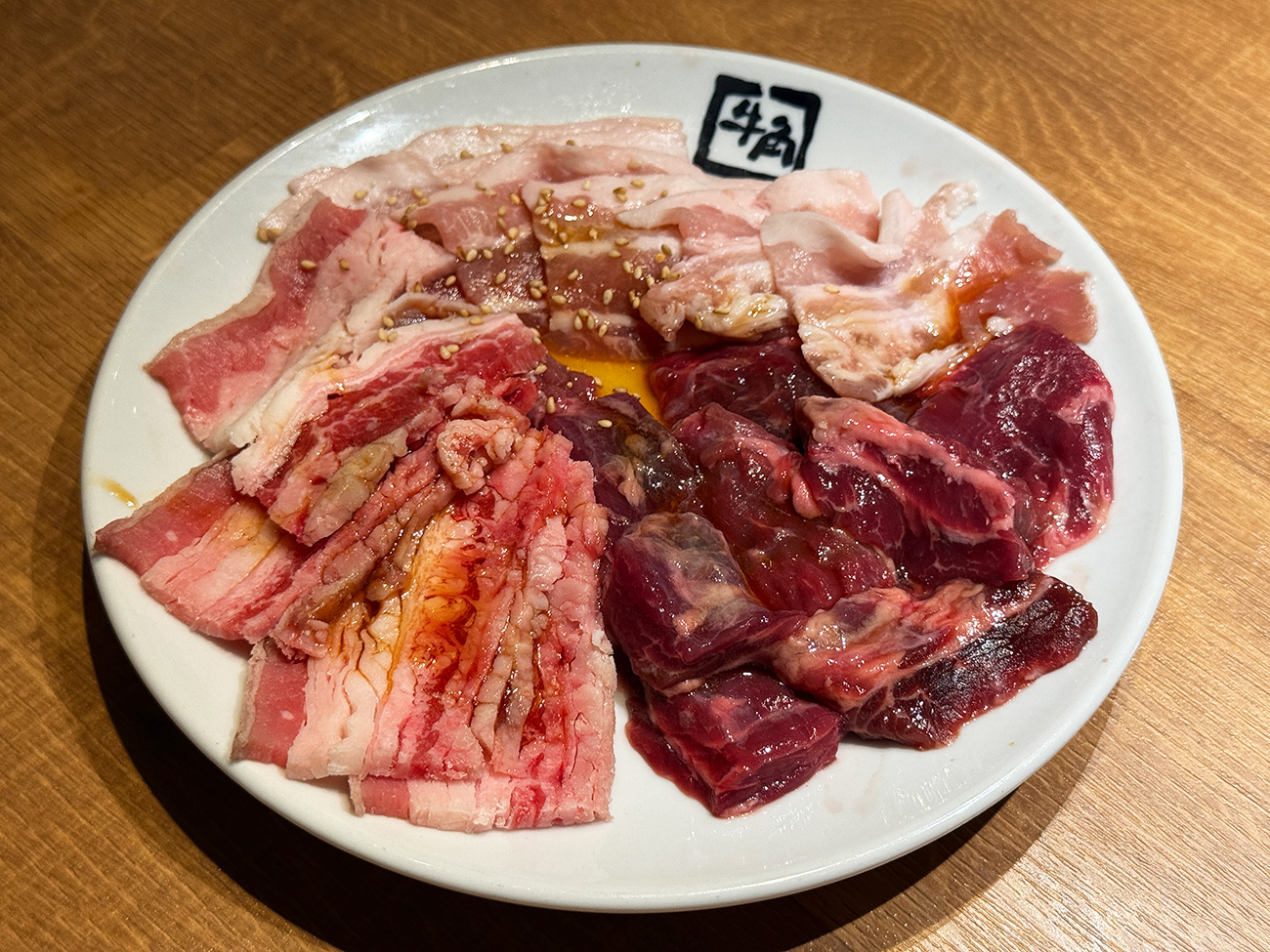 こちらは「定番焼肉盛り」。ジューシーカルビ、牛ハラミ、豚ハラミの3種です。これも2人分なんですが、それなりにボリュームがあるなあ!