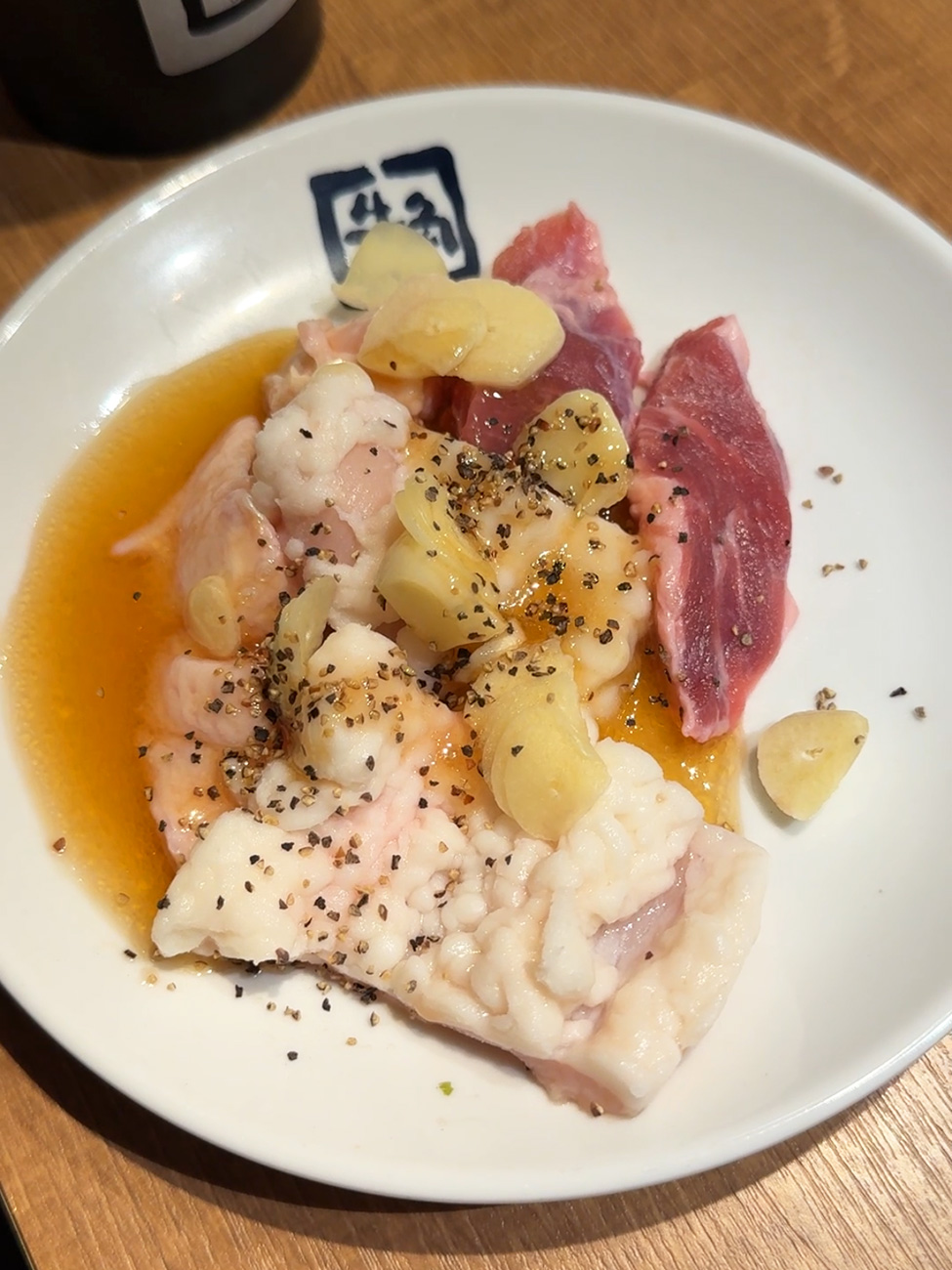 ホルモン盛りはどちらもシマチョウ、豚ハラミ、ぼんちりの3種で、こちらは特製醤油ダレ&黒煎り七味で味付けした「黒MIX」。