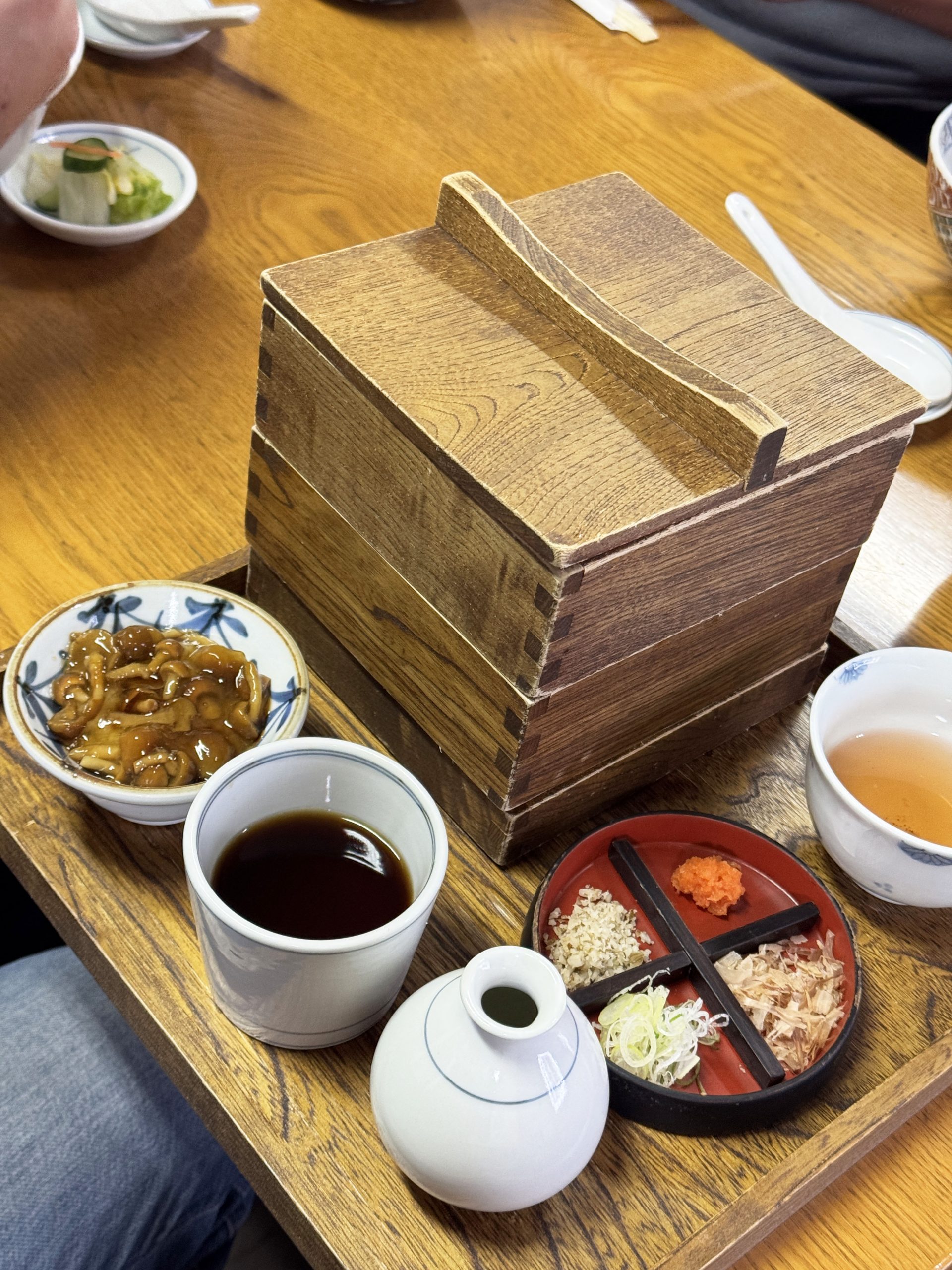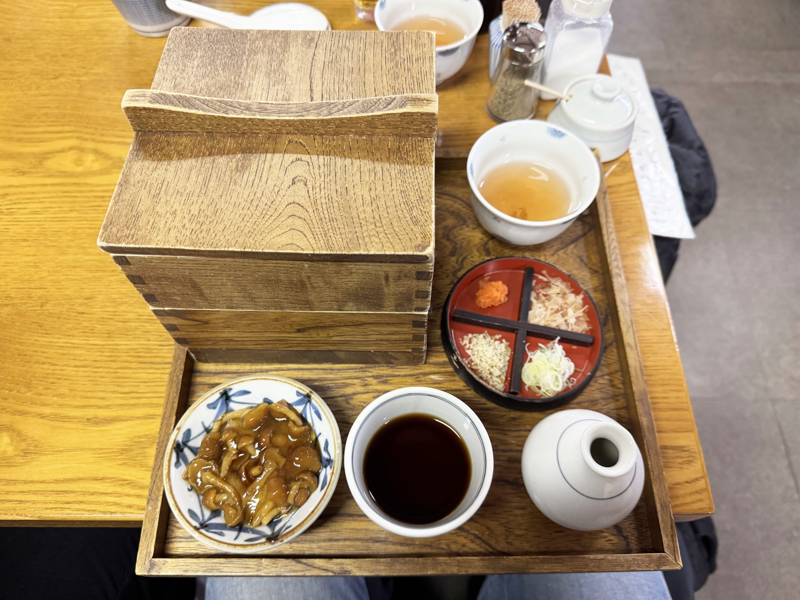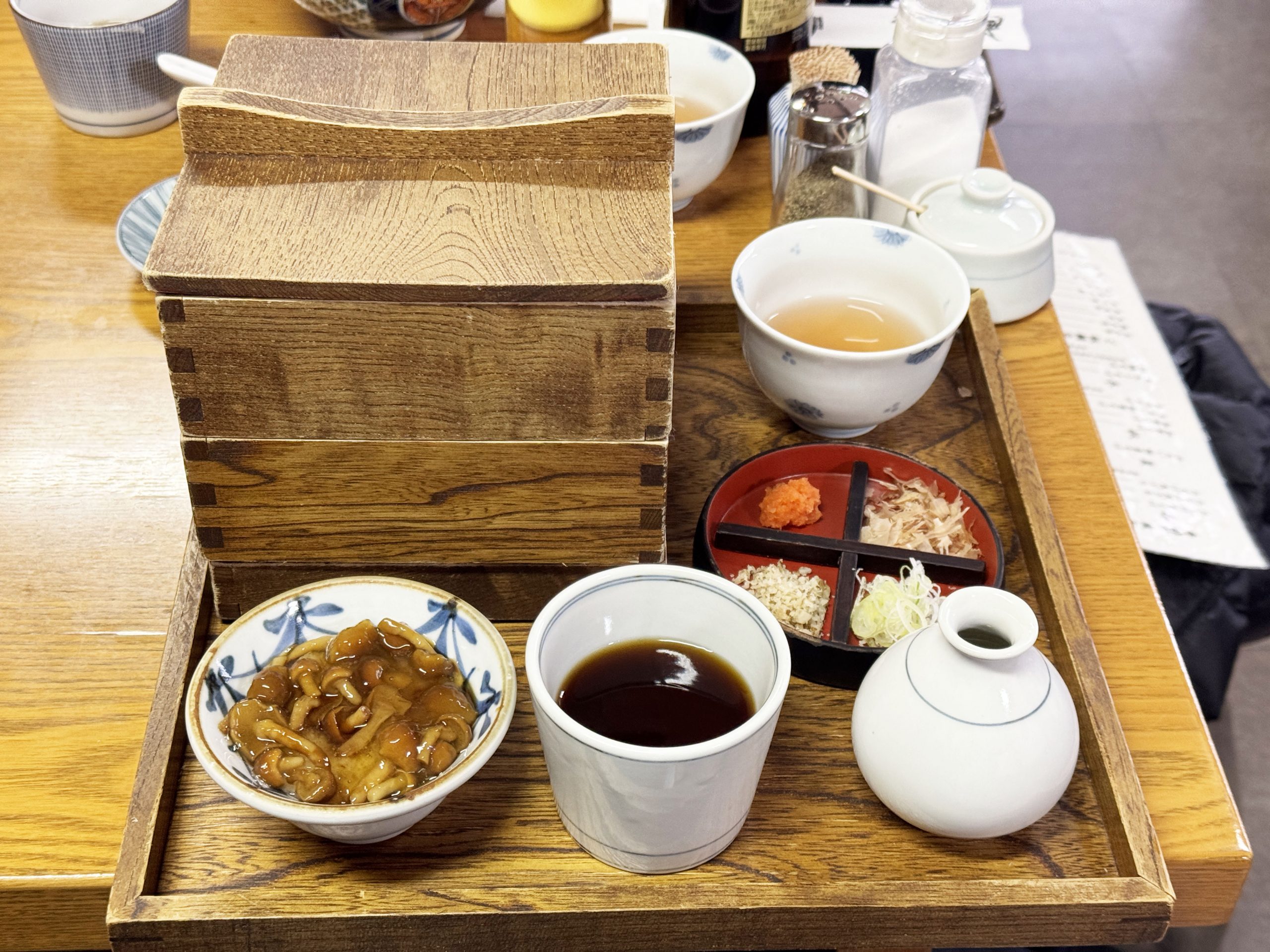 そばつゆ、薬味4種、なめこおろし、そして日本酒がセットになっています。