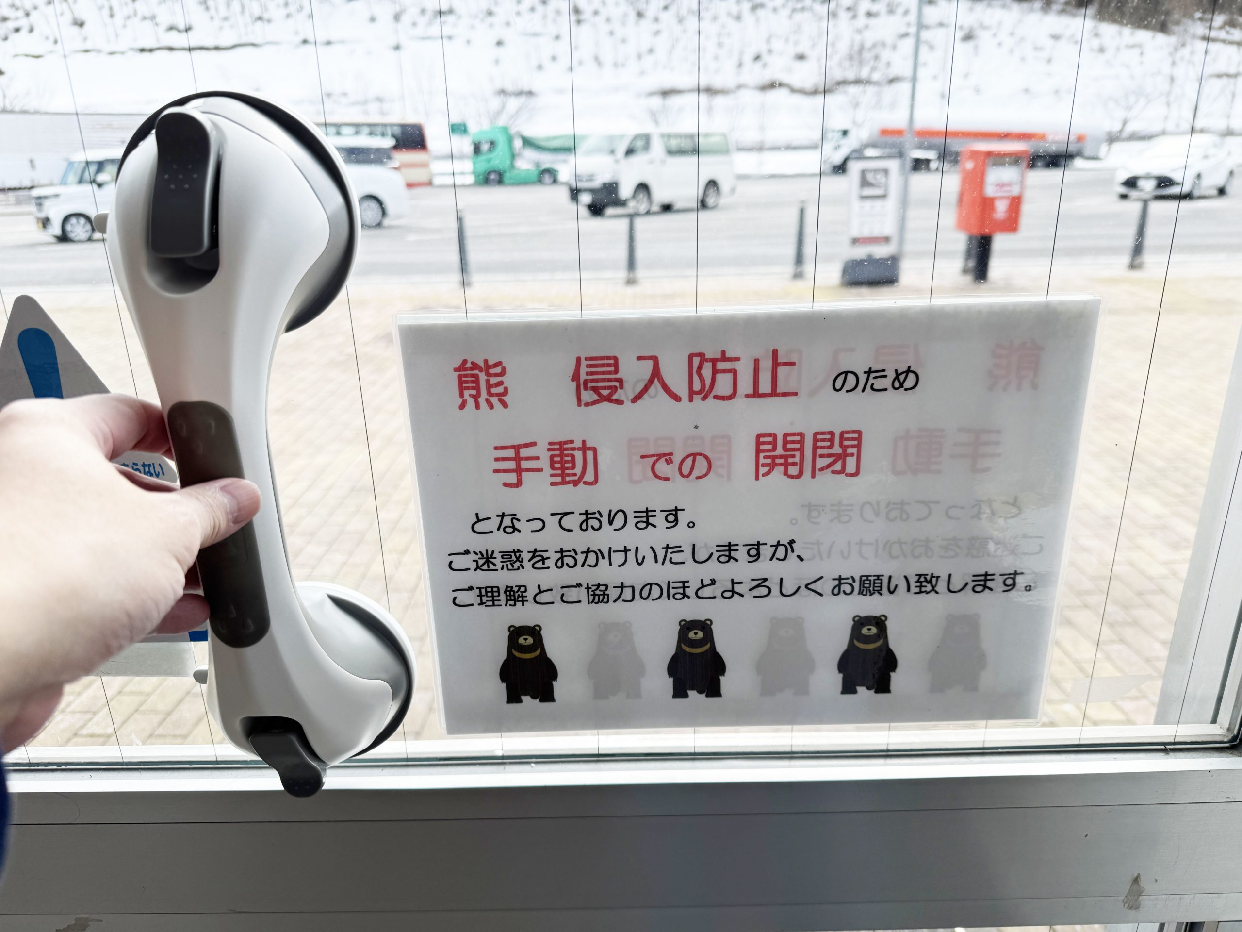これはお願いですが、ここの松屋、熊が侵入しないよう、重めのドアで安全性を保っています。ドアにも「熊侵入防止のため主導での開閉となっております」と書かれていますので、出入りするときは、しっかりと閉めましょう。