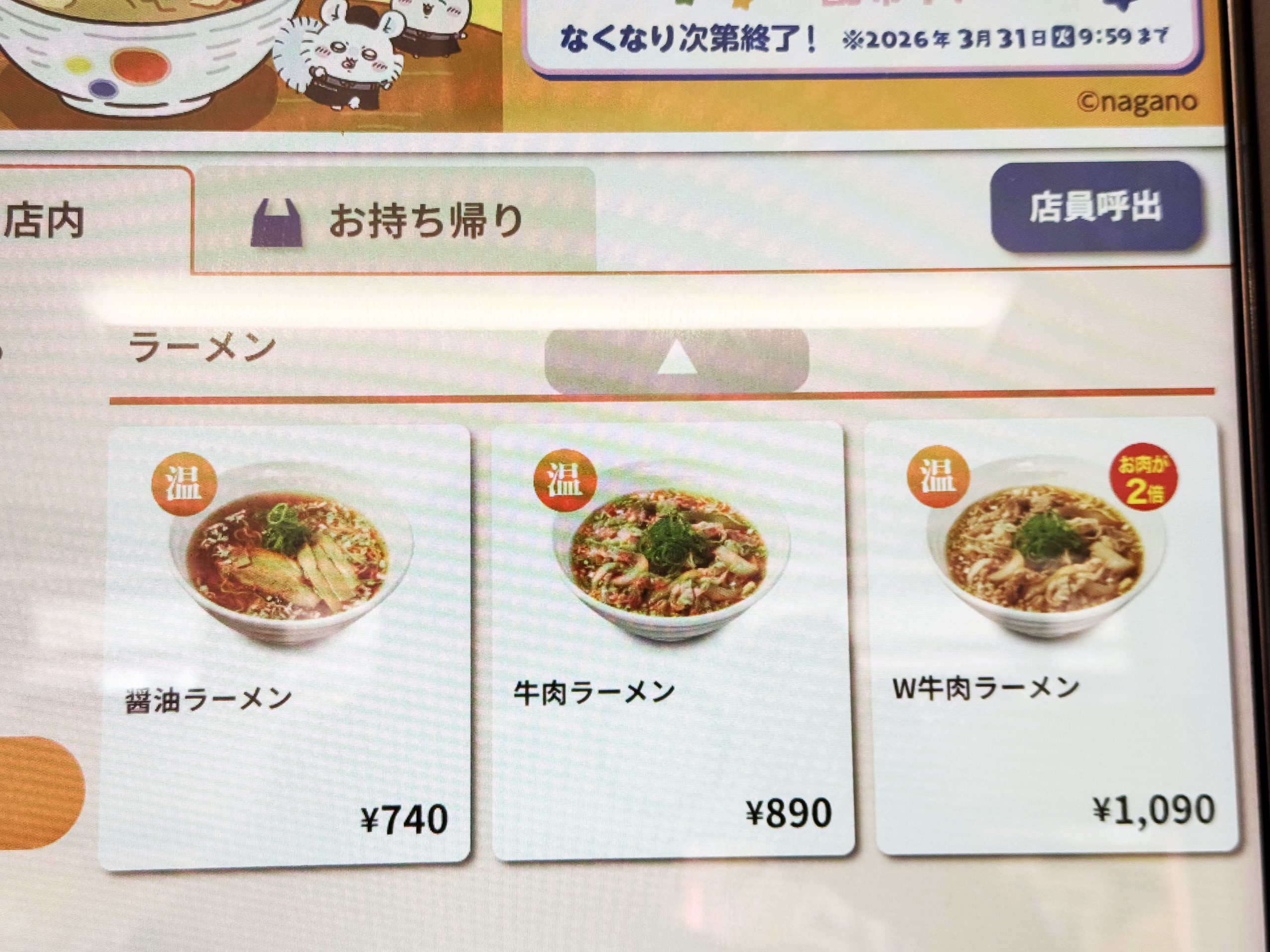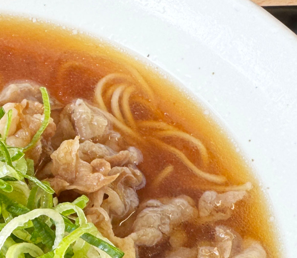ここの松屋で食べられるラーメンは3種類。醤油ラーメン(740円)、牛肉ラーメン(890円)、ダブル牛肉ラーメン(1090円)です。昔ながらの醤油ラーメンだけでなく、なんと、牛めしの牛肉を使用したラーメンが食べられるのです。これは松屋ファンにとって嬉しすぎるラーメン。