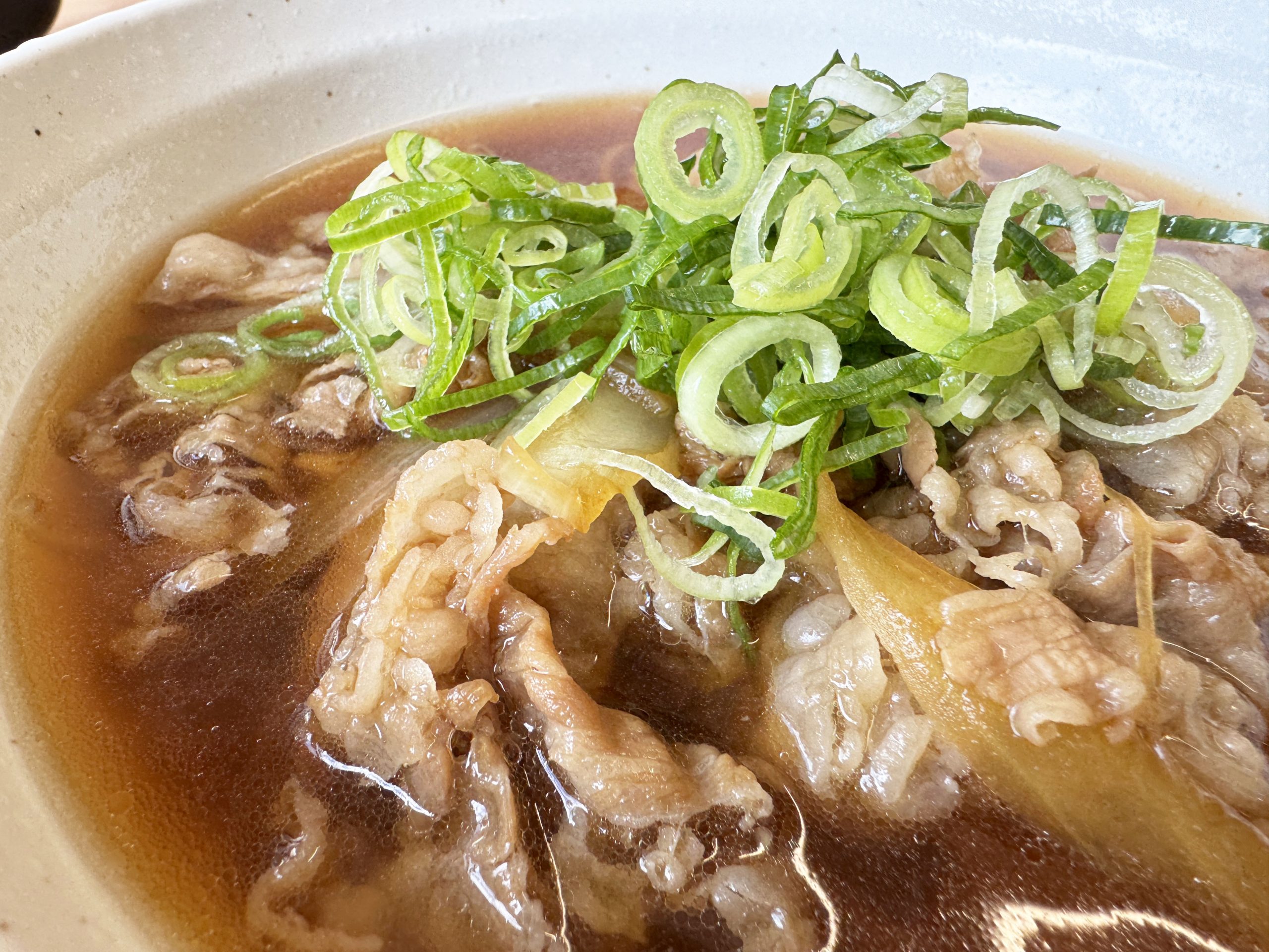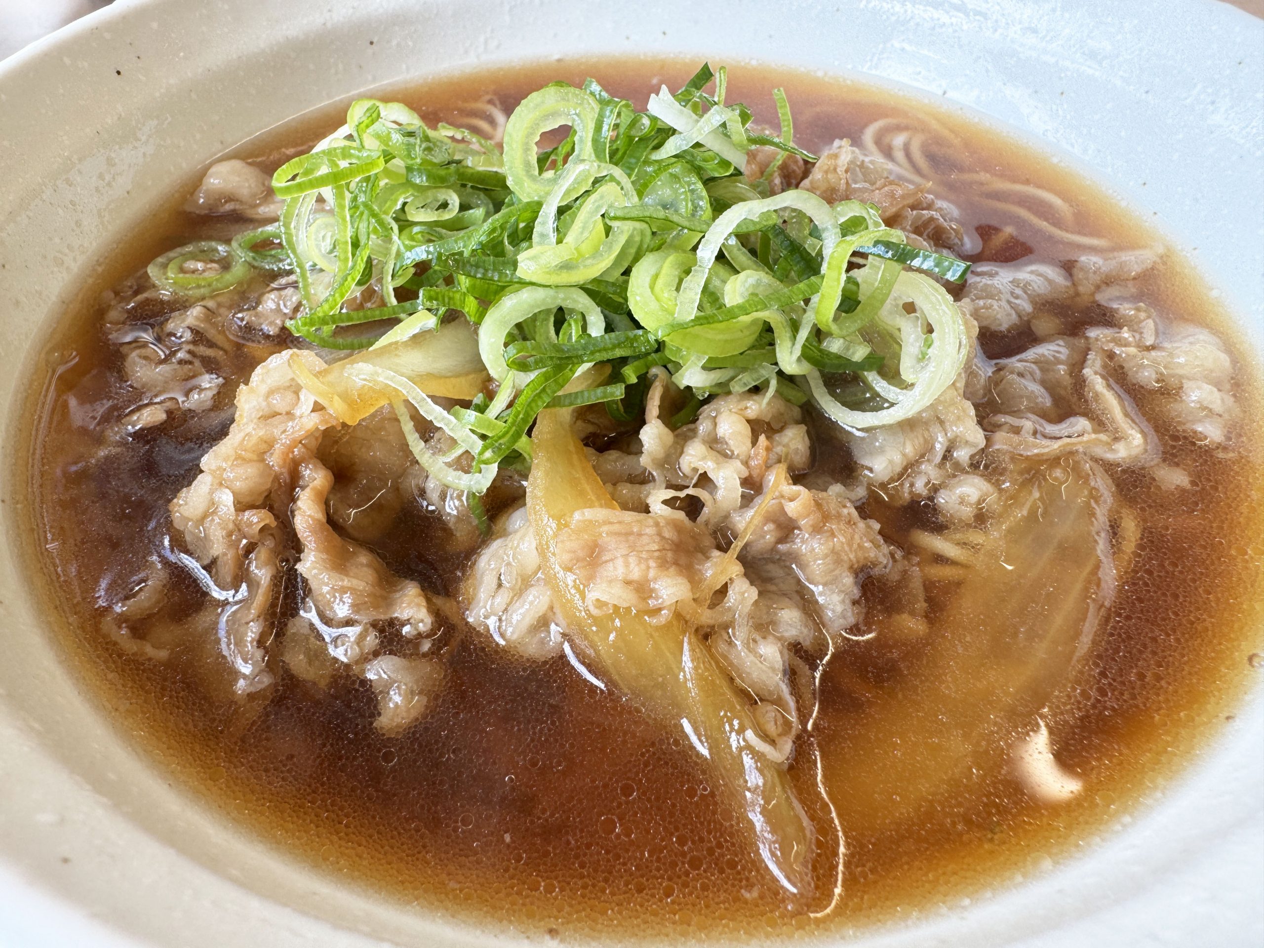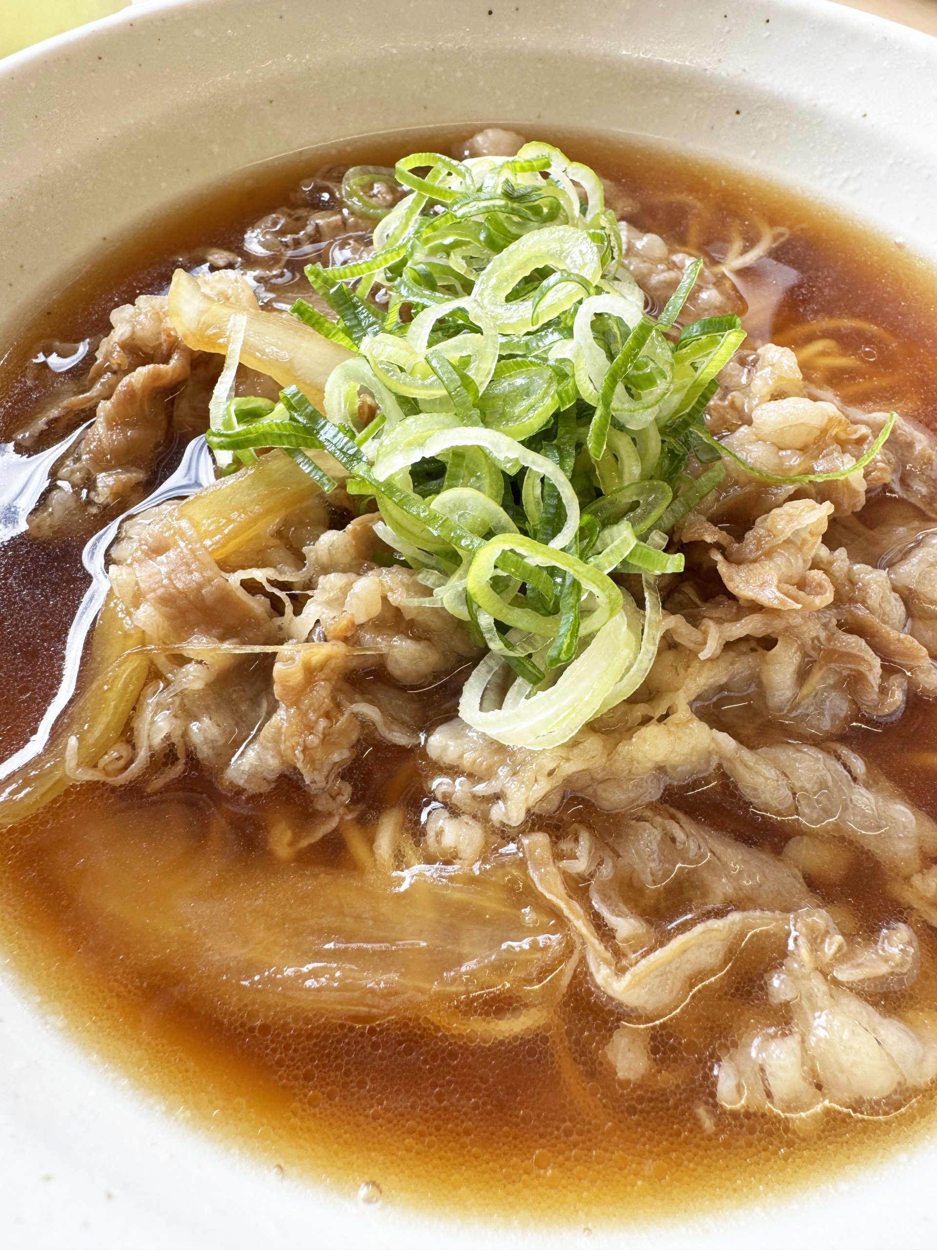 牛肉ラーメンの麺は細麺。そこに、安定のおいしさが楽しめる牛めしの牛肉とタマネギがたっぷりと盛られていて、さらに刻み葱ものせてあります。あまりにも贅沢なラーメンです。スープはツユダクを彷彿とさせる茶褐色。醤油のクリアなスープというより、濁りある濃密濃厚な仕上がり。食べる前からスープの薫りが漂ってきます。