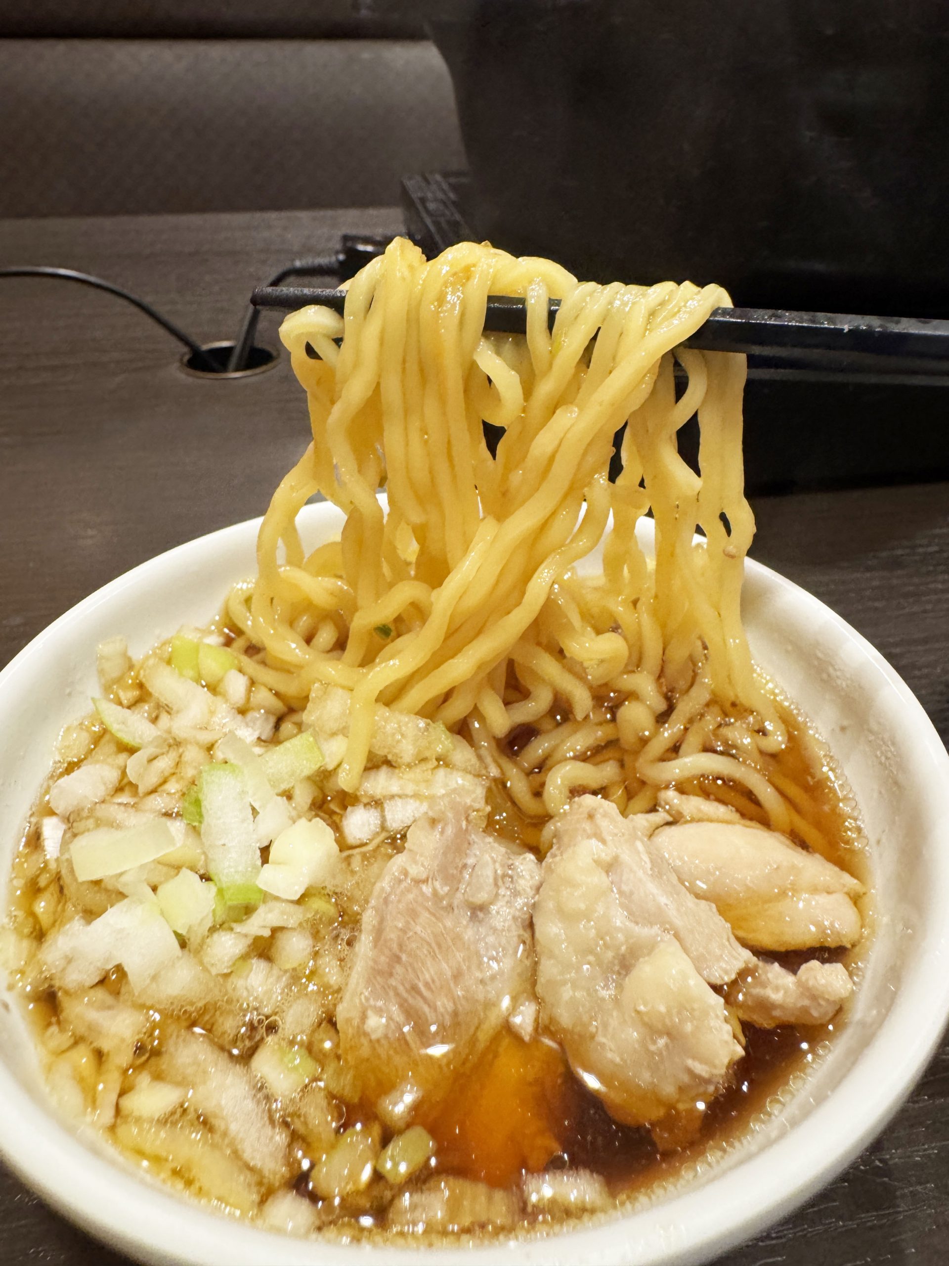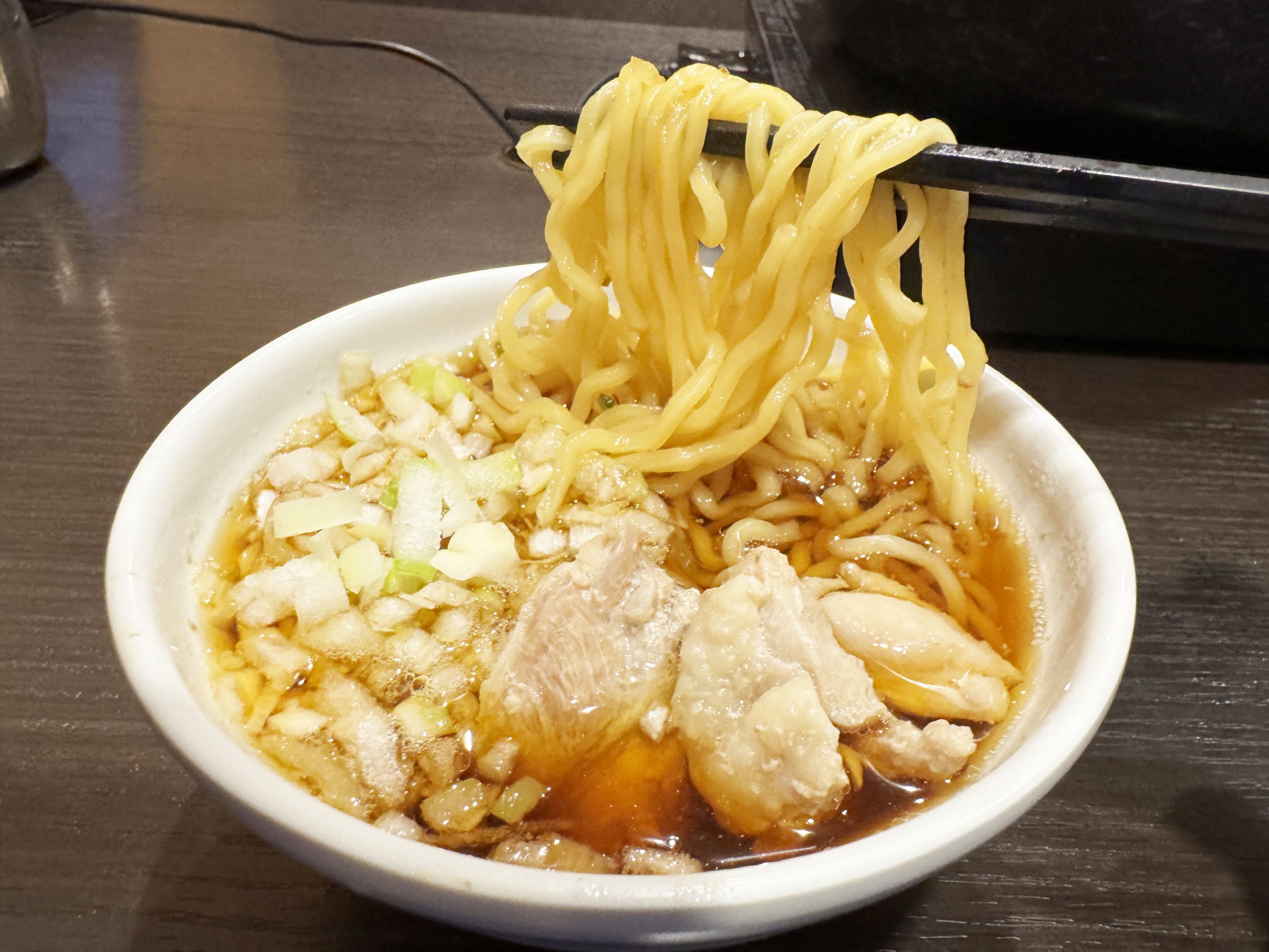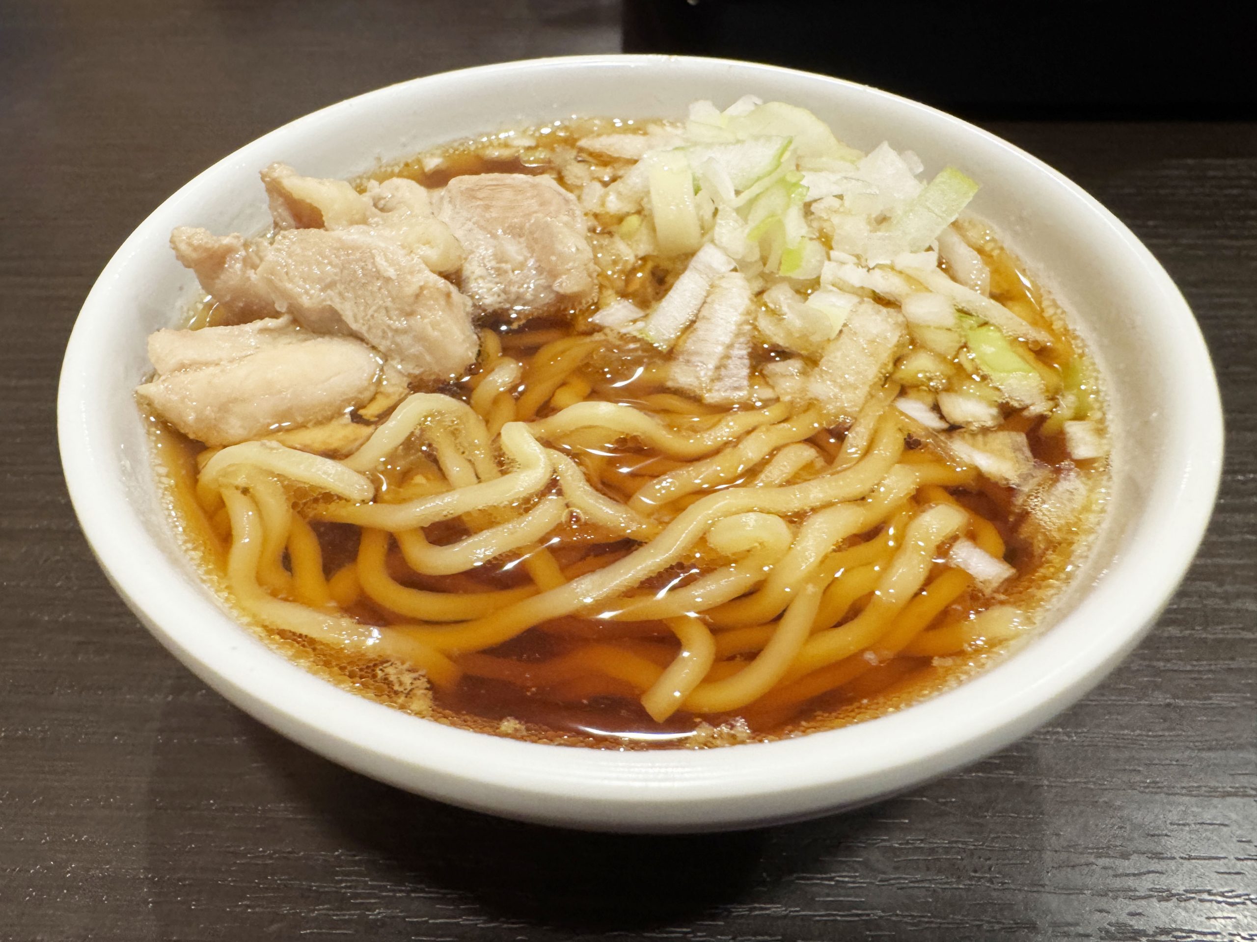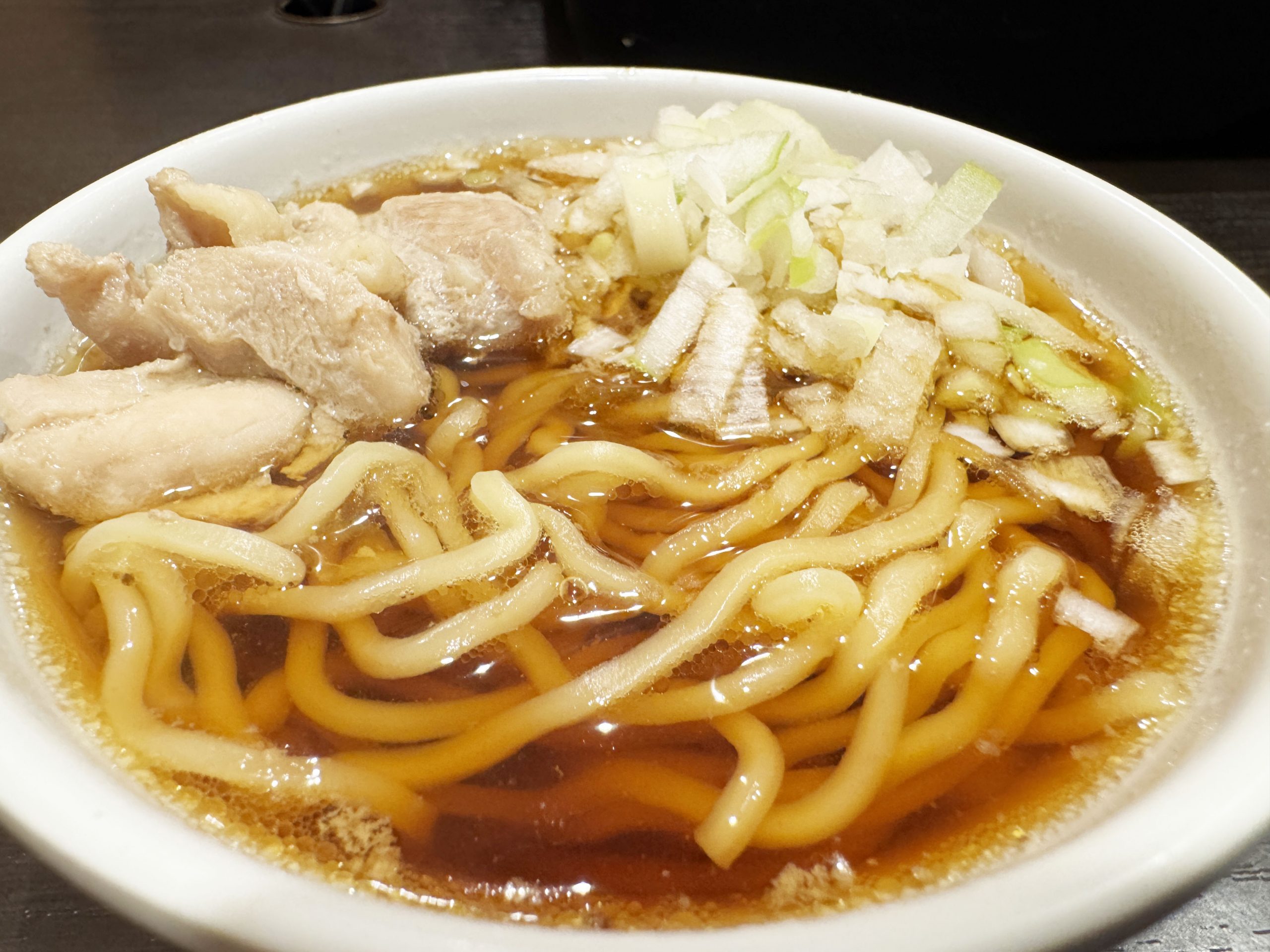 店員さんは、新しくなった中華麺を美味しく食べる方法を教えてくれた。以前よりも長く、3分ぐらいは沸騰したスープで茹でてほしいという。ということで、実際に出汁スープに中華麺を投入して茹でた。3分後、中華麺を出汁スープを注いだ茶碗に入れ、ネギと鶏肉を添えてラーメンの出来上がり。