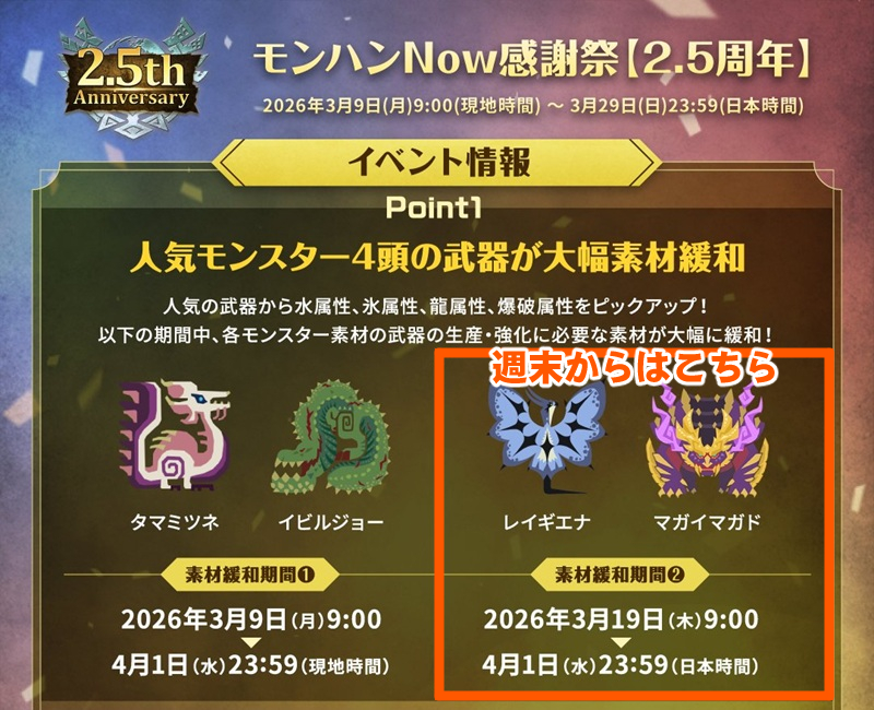 そこで現在、人気の高いモンスター4頭の武器を生産強化するのに必要な素材が緩和。