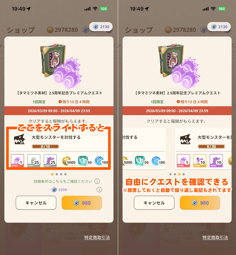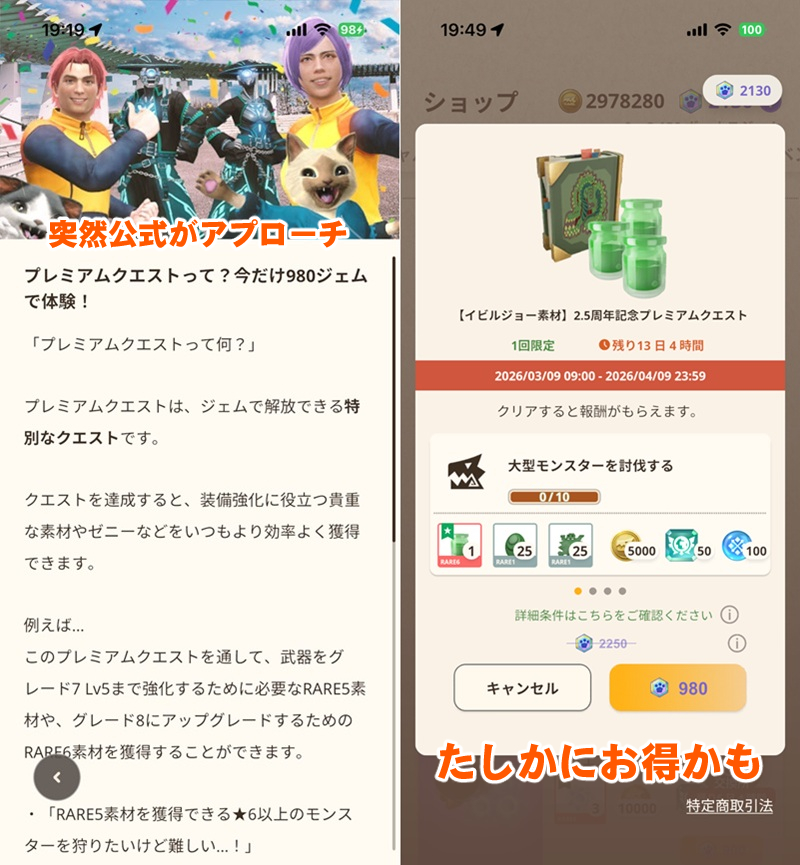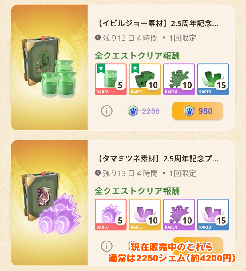 それが現在、イビルジョーとタマミツネを対象にしたプレミアムクエストが、通常価格2250ジェムのところ980ジェム(約1900円)で購入可能になっている。