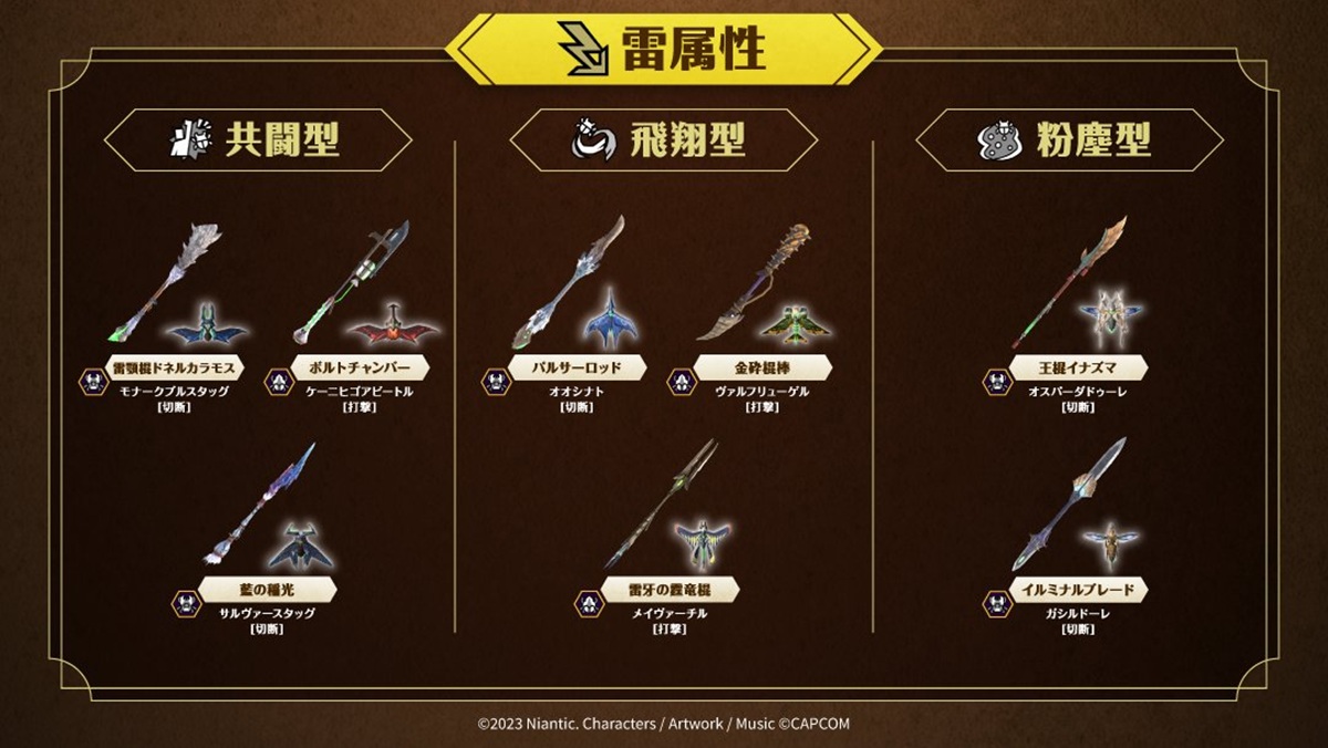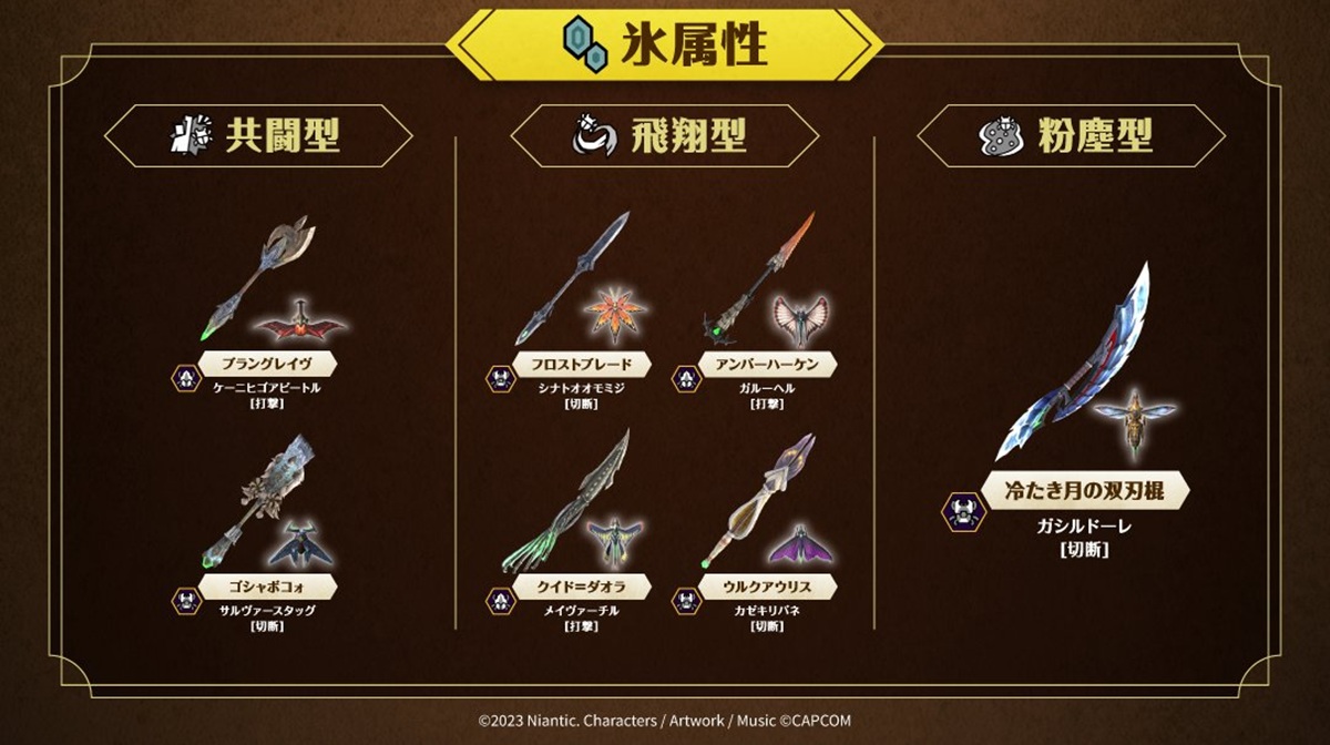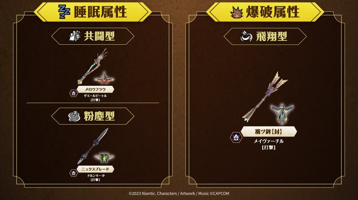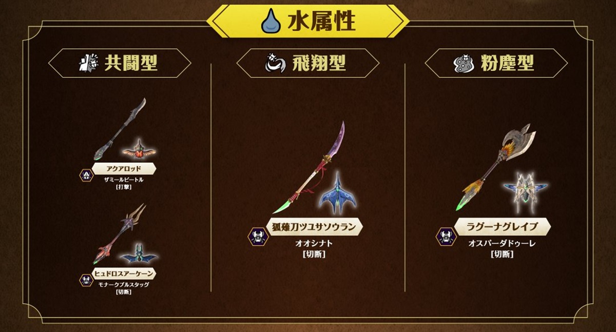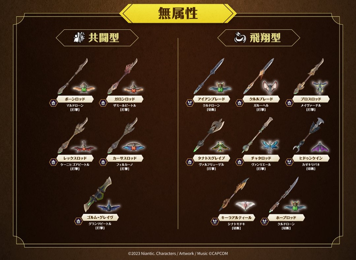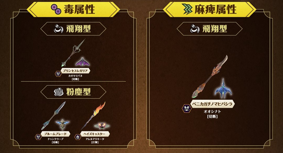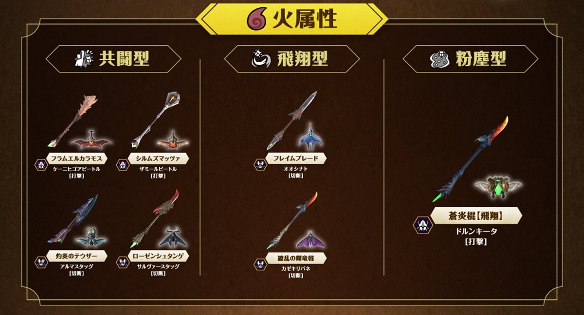 それに先駆け、公式より全10属性別の生産可能な操虫棍リストが解禁された。