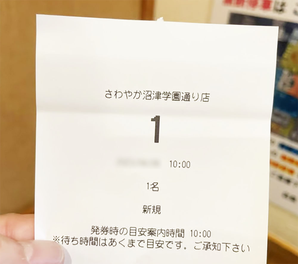 筆者は比較的混んでいないと言われている「さわやか 沼津学園通り店」(静岡県沼津市神田町6-26)に行ったことがある。開店前の朝9時20分から並んだところ一番手。そのあと一気に行列ができた。10時になると店員さんが店内に誘導し、整理券を発券。11時になったら店舗に戻るようにと言われた。つまり9時20分から11時まで、1時間40分待つことになった。さわやかにおいて、1時間40分で着席できる流れはスムーズといえる。
